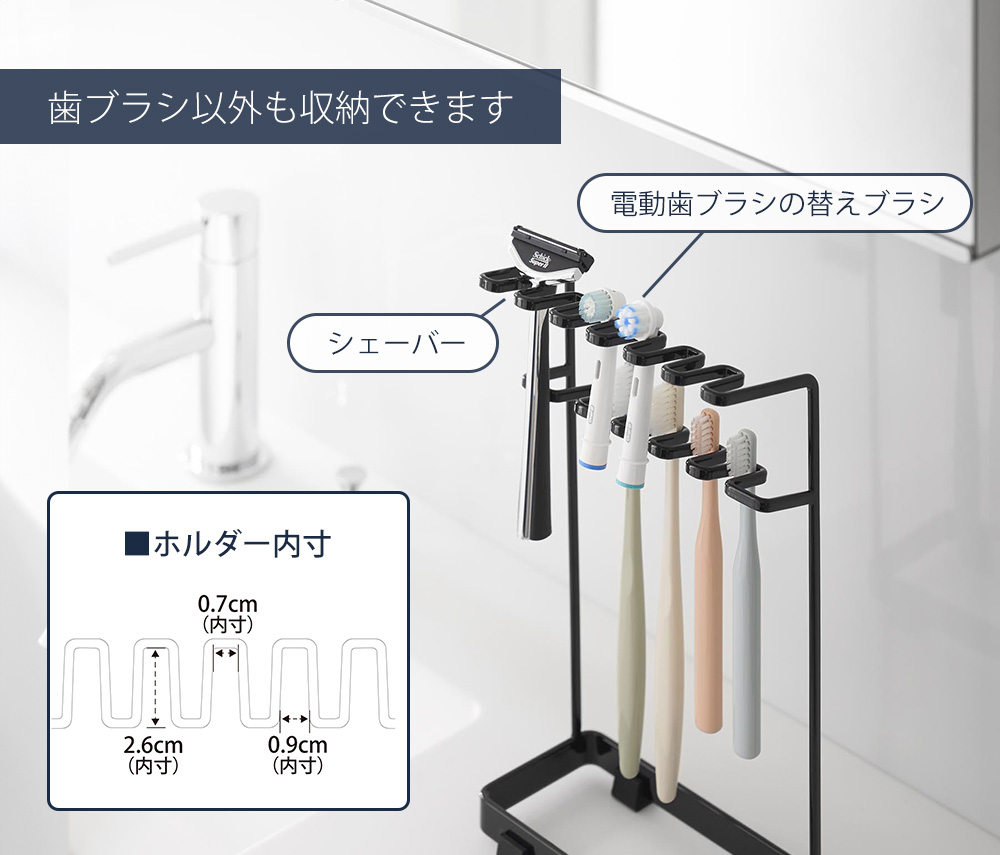 歯ブラシ以外にシェーバーや、電動歯ブラシの替えブラシ収納にもご使用いただけます。
