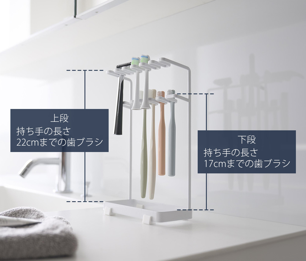 上段は持ち手の長さが22cmまでの歯ブラシ、下段は持ち手の長さが17cmまでの歯ブラシに対応しています。