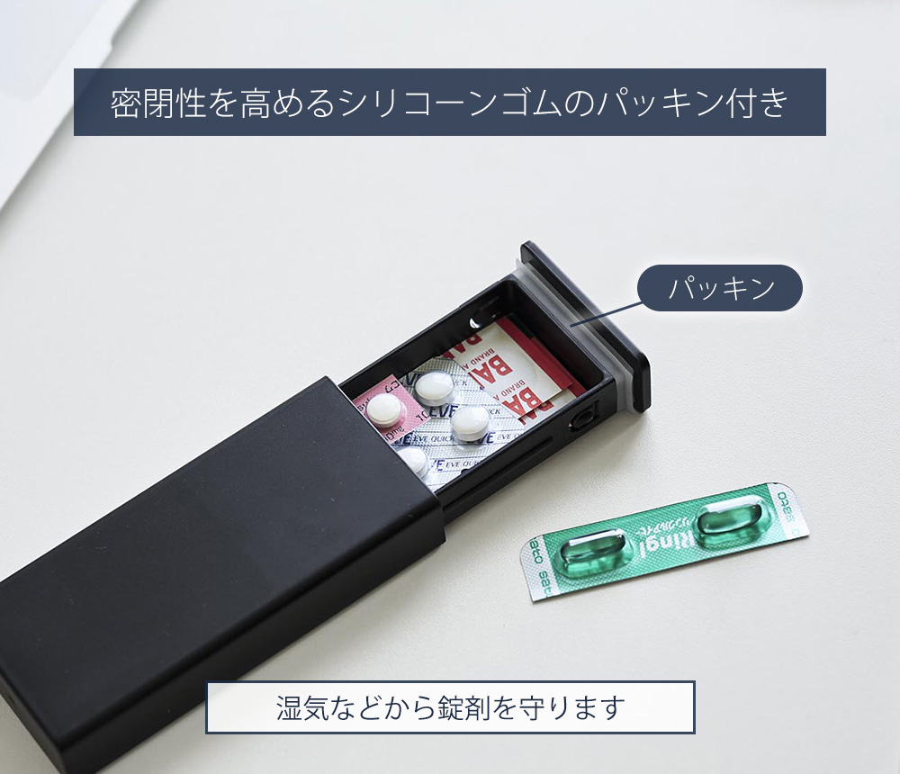 密閉性を高めるシリコーンゴムのパッキン付き。大事なお薬を湿気や雨などから守ります。