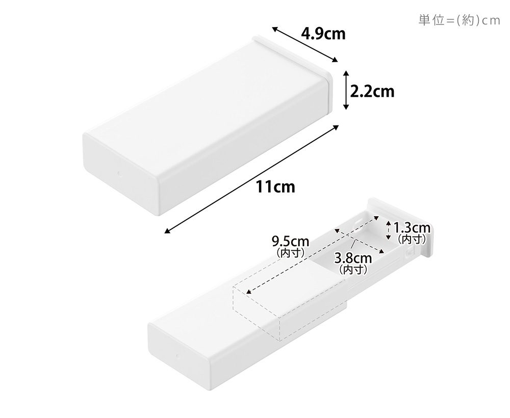ケース全体の大きさは約幅11×奥行4.9×高さ2.2cm。収納部は約幅9.5×奥行3.8×高さ1.3cmです。