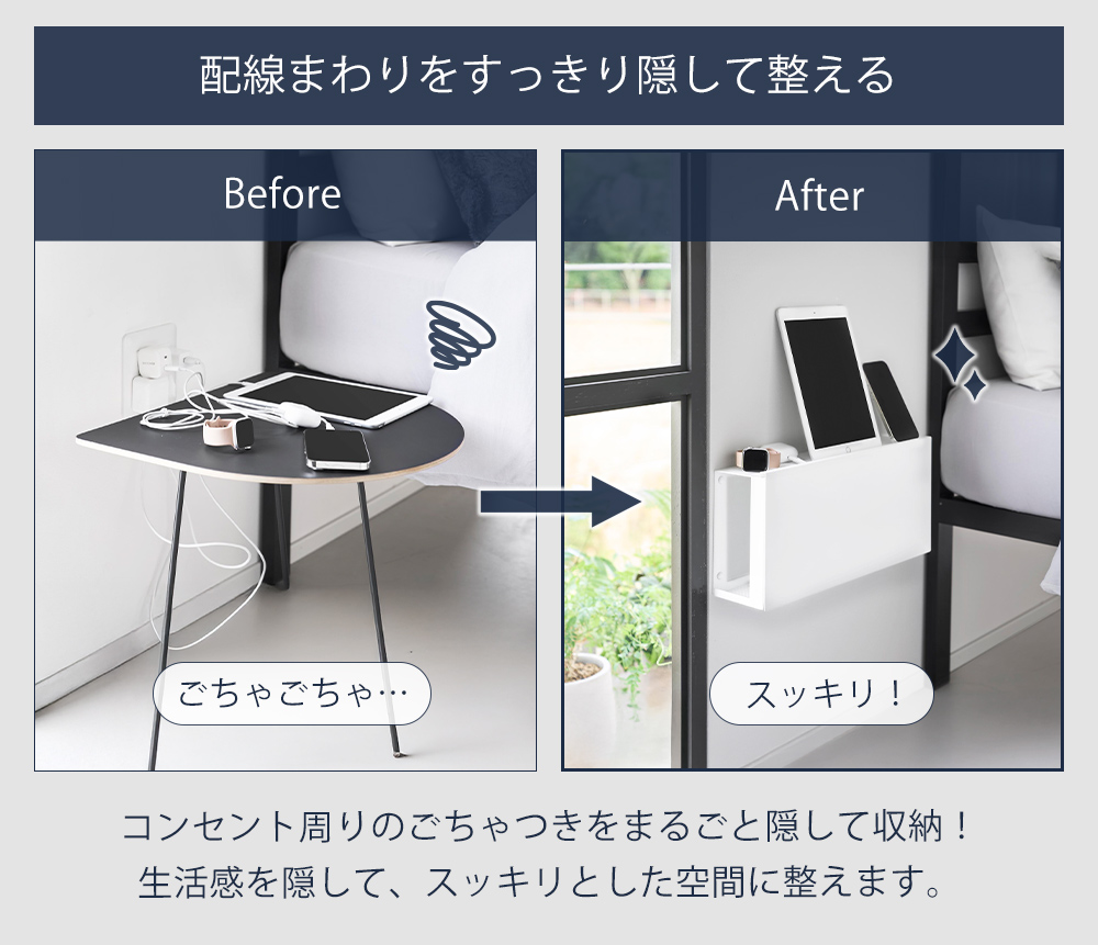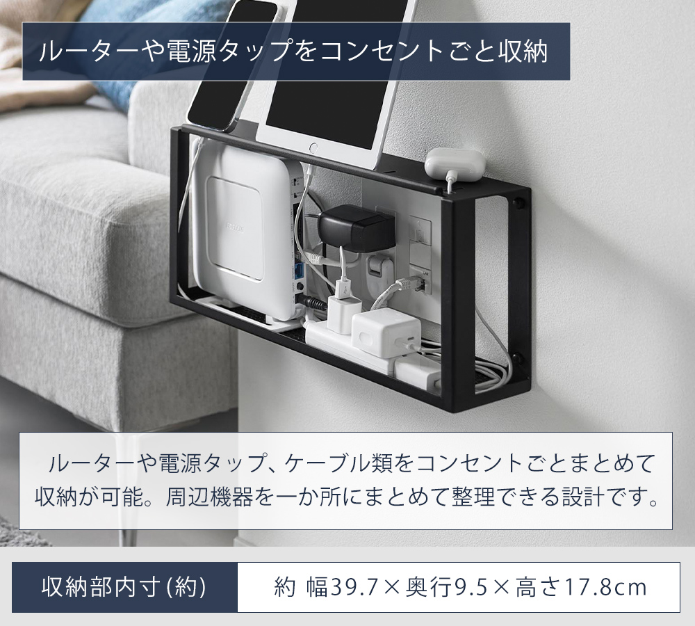 テーブル周りや壁際に散らかりがちなルーターや電源タップ、充電ケーブルなどをまとめて収納できます。配線を隠しながら整理できるので、生活感を抑えたすっきりとした空間づくりに役立ちます。