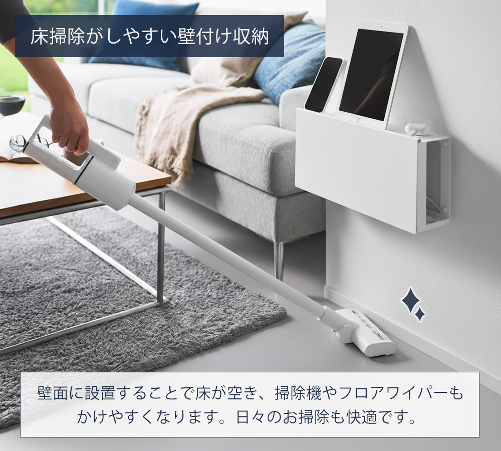 壁面に取り付けて使用することで床に物を置かずに収納できます。家具の下や壁際も掃除機をかけやすく、フロアワイパーもスムーズに通せるので日々のお掃除が快適になります。