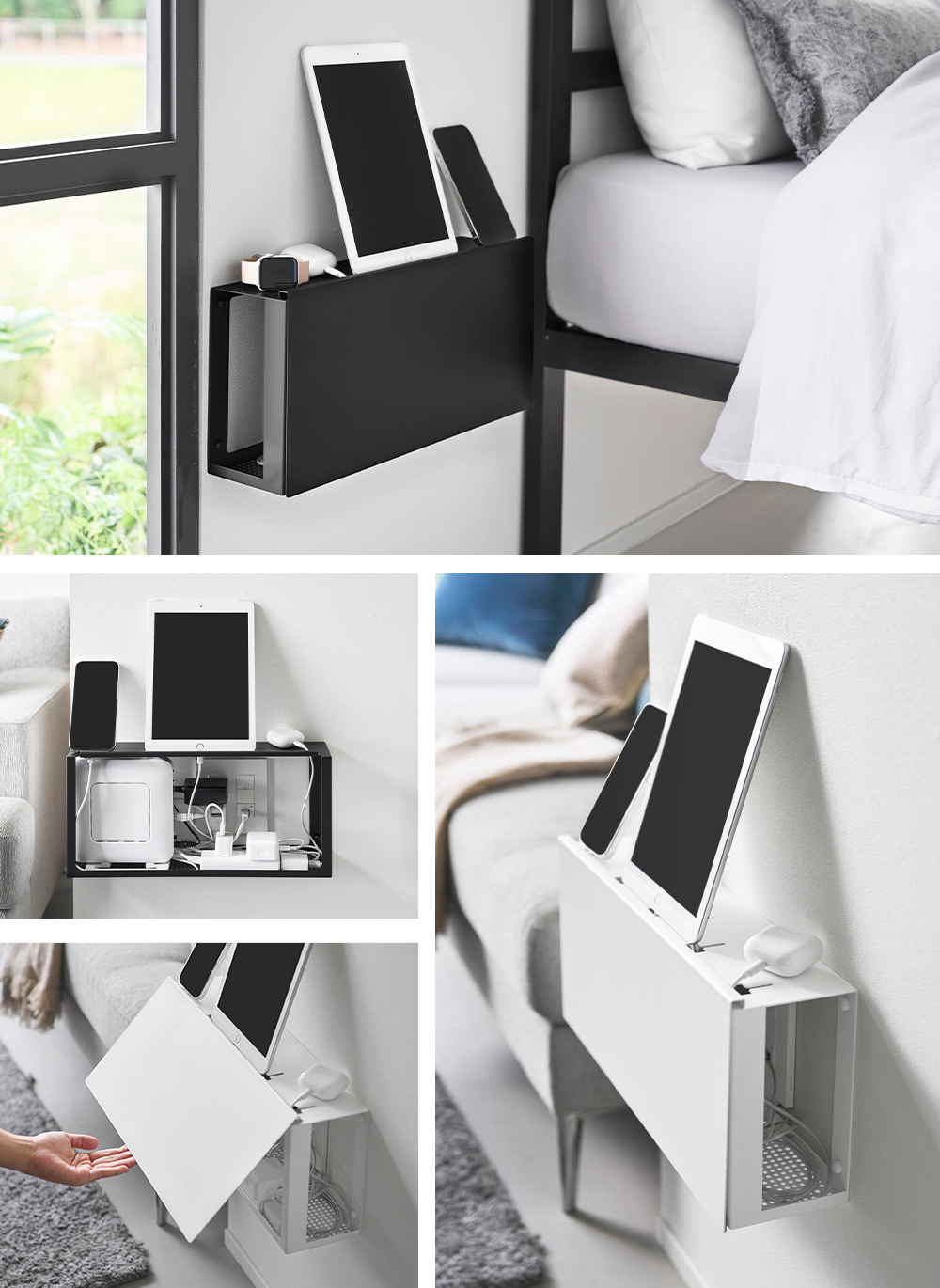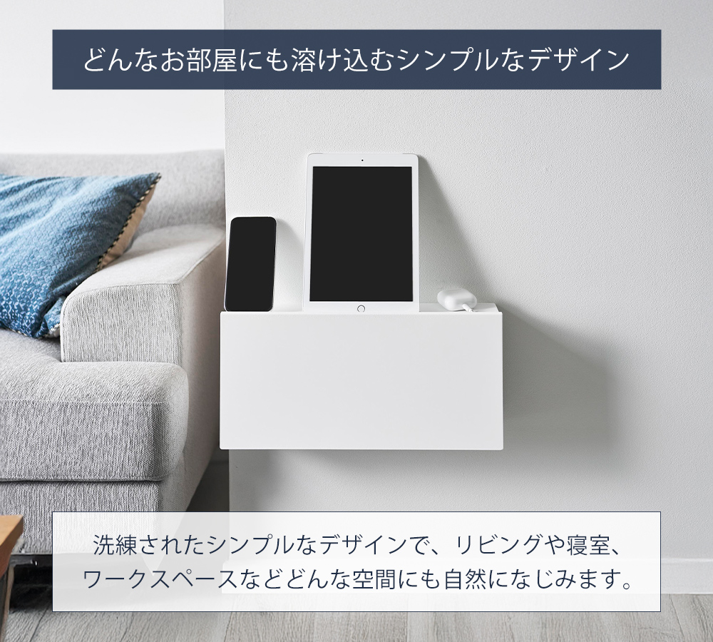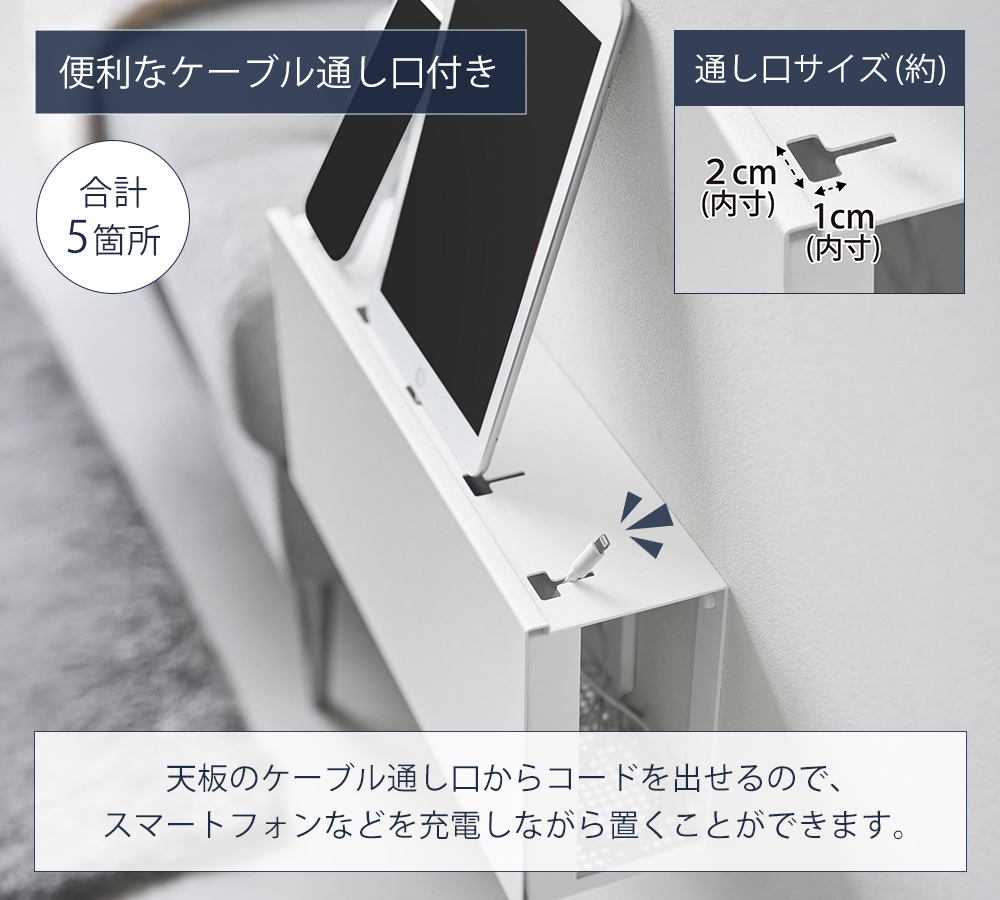 天板にはケーブルを通せる開口部があり、コードを通してスマートフォンやタブレットなどを充電しながら置くことができます。配線を隠しながら、デバイスの置き場としても便利に使えます。