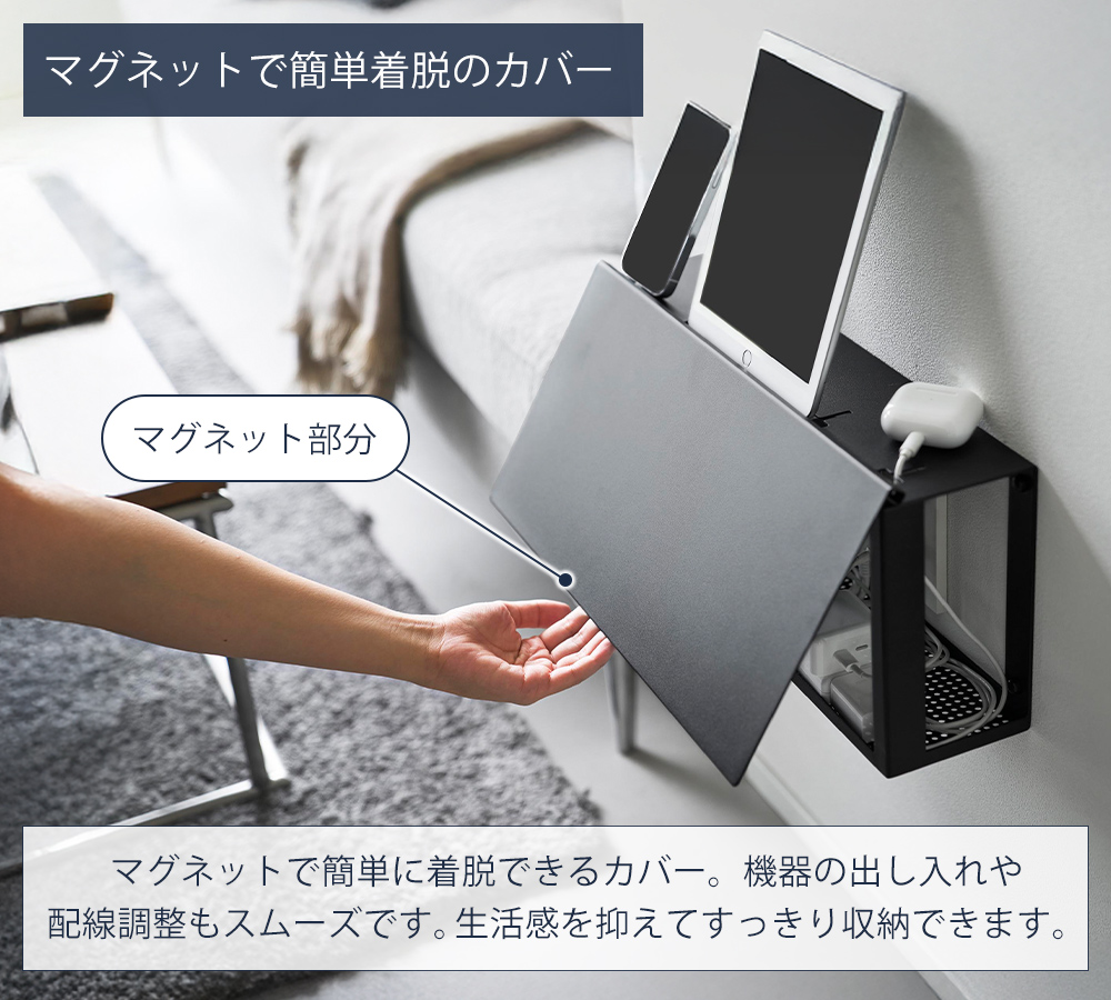 前面カバーはマグネット式で固定されており、手軽に取り外しが可能。機器の出し入れや配線の調整もスムーズに行えるため、内部を隠しながら使いやすく収納できます。