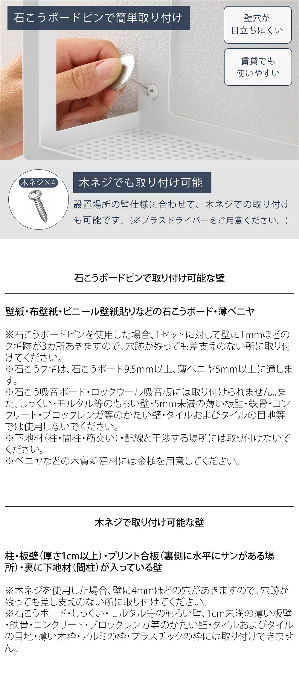 付属の石こうボードピンを使えば、壁穴が目立ちにくく簡単に取り付けができます。壁紙の上からでも設置できるため、賃貸住宅でも使いやすい仕様です。さらに、設置場所の壁の仕様に合わせて木ネジでの取り付けも可能です。
