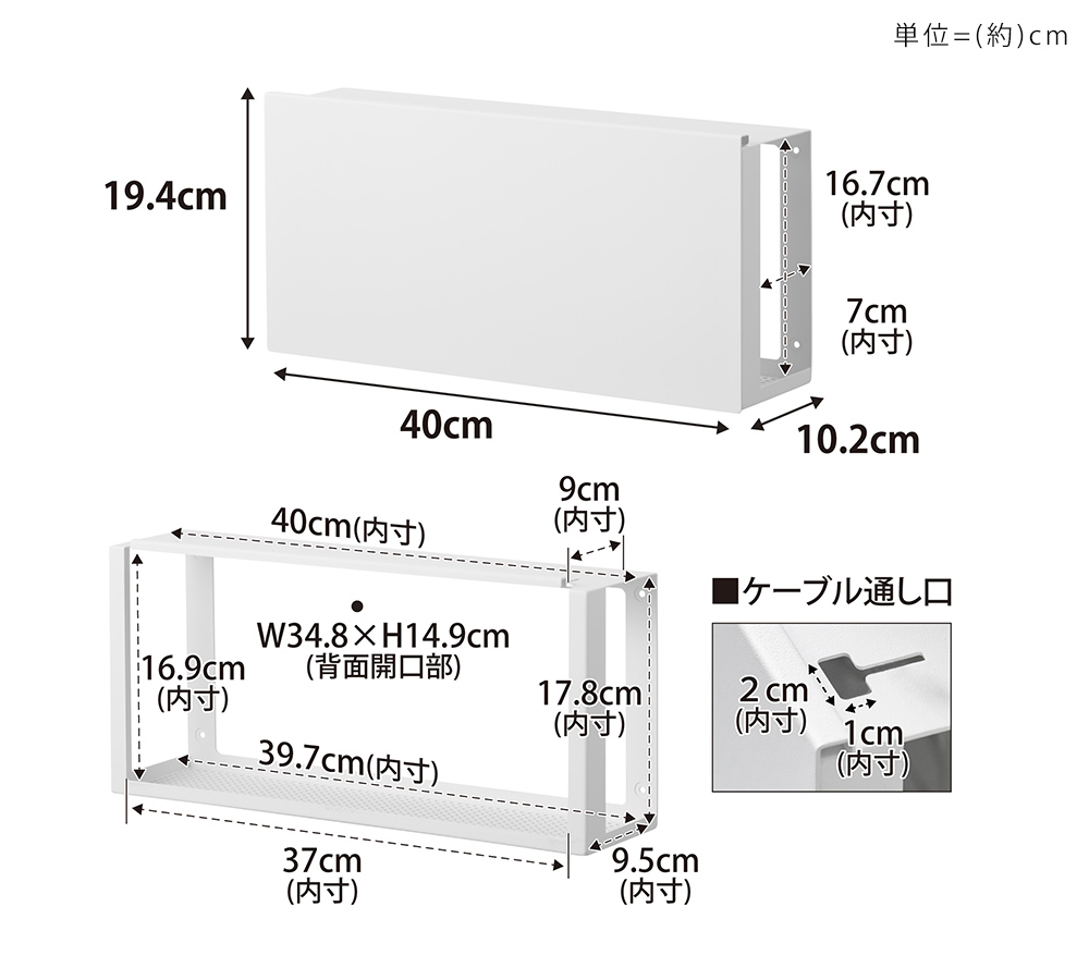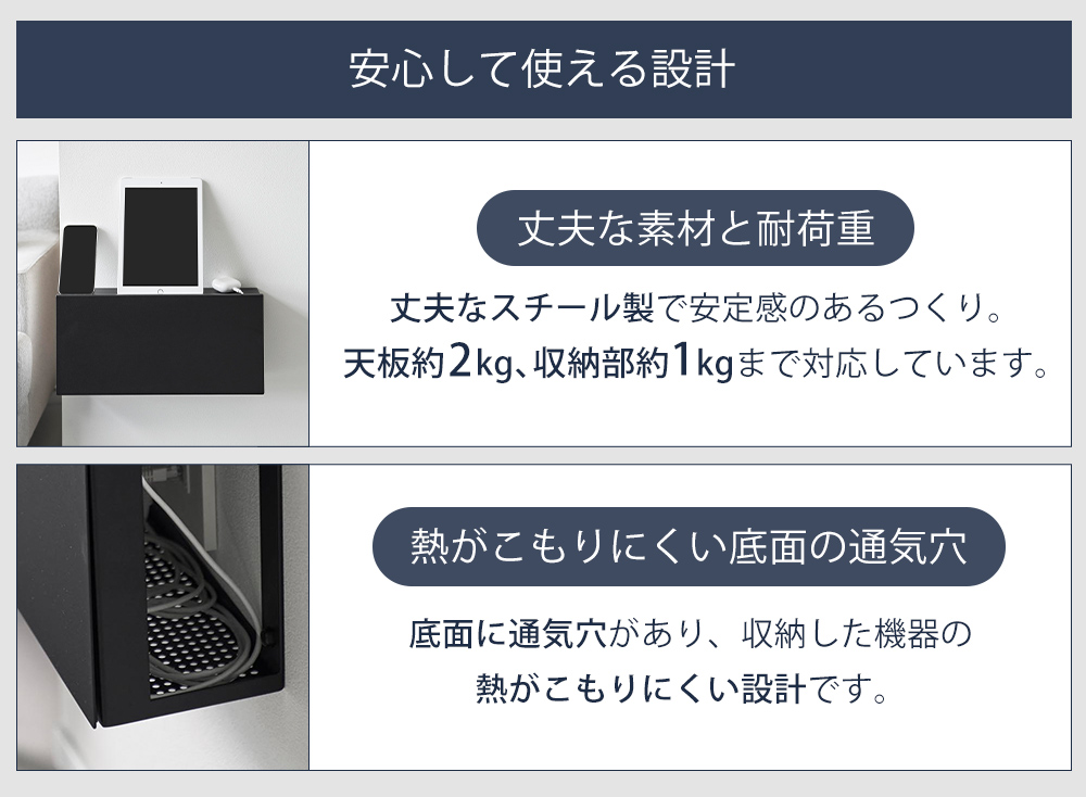 本体には丈夫なスチール素材を使用し、ルーターや電源タップなどの機器を安定して収納できます。さらに底面には通気穴を設けており、収納した機器の熱がこもりにくい設計で、安心してお使いいただけます。