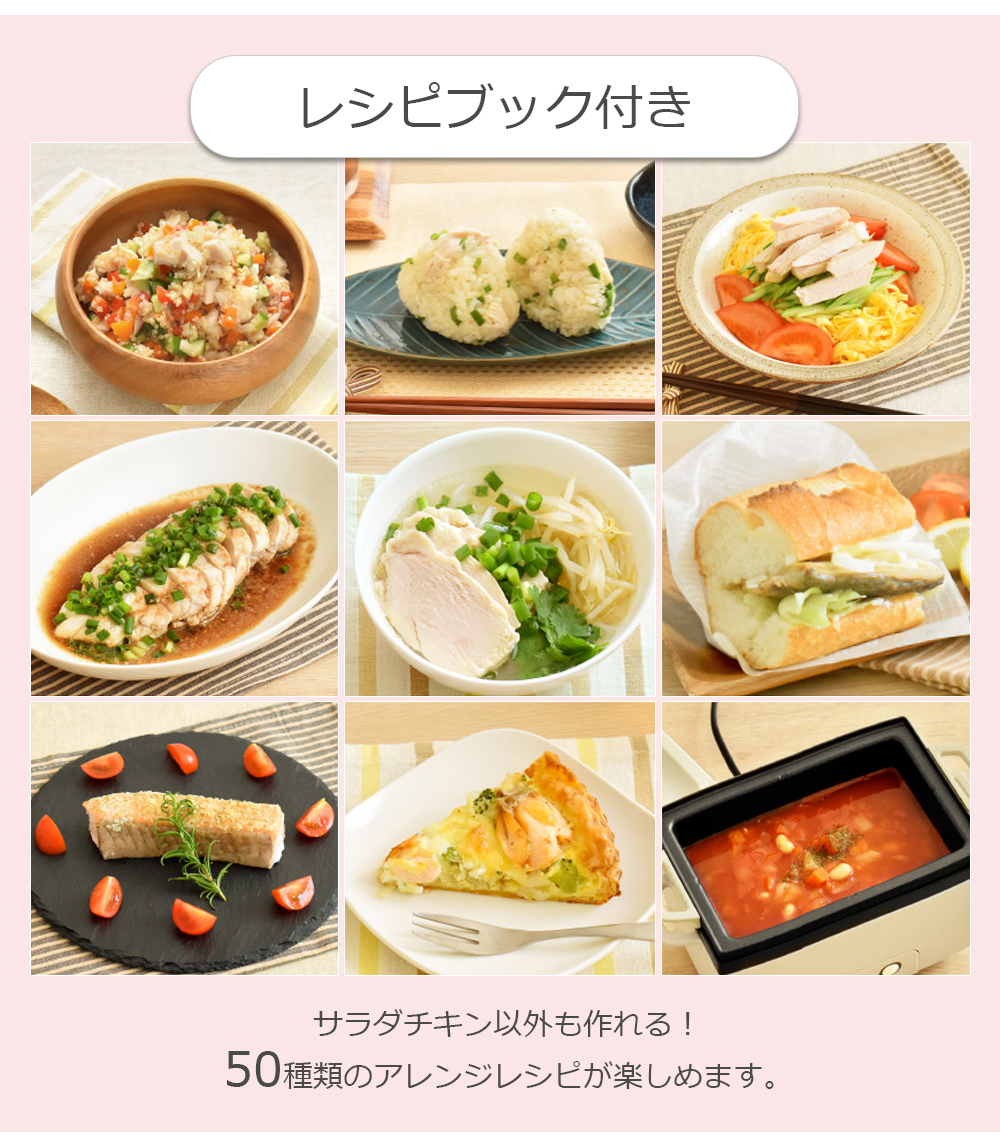 ボタン一つの簡単調理だから毎日作れる。付属のレシピブックで広がる味のバリエーション。低糖質高たんぱくなサラダチキンでヘルシーな食生活が手軽に叶います。