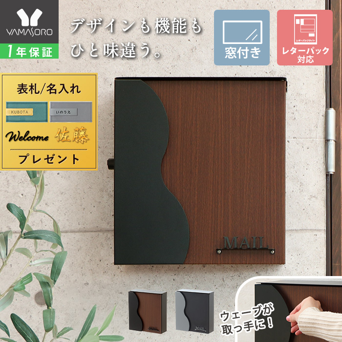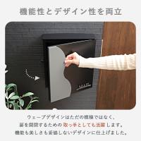 取っ手にもなるおしゃれなウェーブデザインが目を惹く壁掛けポスト。2トーンの配色で程よい存在感を醸し出し、玄関先からおしゃれに迎えます。MAILの立体サインが高級感を演出します。メール便・レターパック対応の大容量サイズで、投函口は上部にあり正面からは見えないため、全体がすっきりした印象に。蓋付きのため、雨の侵入を防ぎ郵便物を守ります。取り出し口は大きく開き、中身が取り出しやすい設計です。落下防止バーが付いているので、たくさんの郵便物が入っていても安心です。側面には扉を開けずに郵便物を確認できる窓付き。さらに、鍵付きひねり錠が付いているので防犯面も安心です。万が一に備え、スペアキーも付属しています。ハンドルをひねるだけで鍵を使わない簡易施錠も可能です。ガルバナイズド加工を施したスチール素材を使用しているため、錆びにくく、耐久性があり、長くお使いいただけます。水が入りにくい折り返し構造や衝撃音を緩和するフェルト付きなど細部もこだわっています。