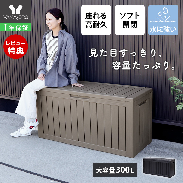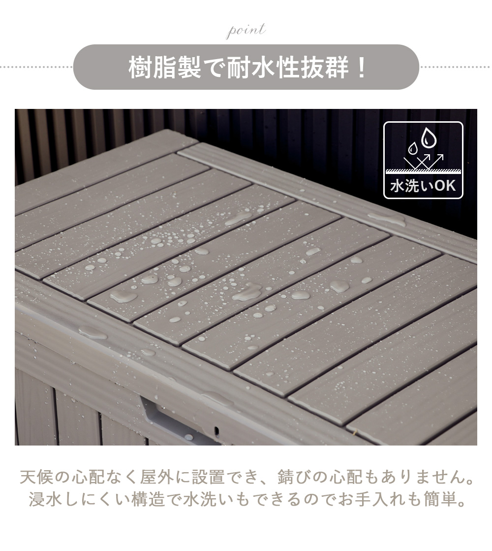 屋外でも屋内でも使用可能な大容量ストレージベンチボックス。樹脂製のため、屋外に設置しても錆びの心配がありません。浸水しにくい構造で水洗いもできるので、お手入れも簡単。大容量の300Lサイズは、45Lのゴミ袋が約6.7個分も収納できます。ゴミストッカーとして使用したり、ガーデニング用品やアウトドア用品、お子さまの遊び道具などの収納に使用したり、灯油や災害用グッズの保管に使用したりと様々なシーンで活躍します。南京錠が取り付けられる鍵穴付きで防犯面も安心のため、宅配ボックスとしてもご使用いただけます。高耐久設計のため、椅子としても活躍。さらに、持ち運びやすい軽量であることも樹脂製のポイント。持ち手も付いており、簡単に移動できます。蓋にはガスシリンダーが付いており、軽い力で開閉が可能。簡単組み立て&分かりやすい電子説明書付き。表面の凹凸感までこだわった繊細な木目柄のお洒落なデザインです。