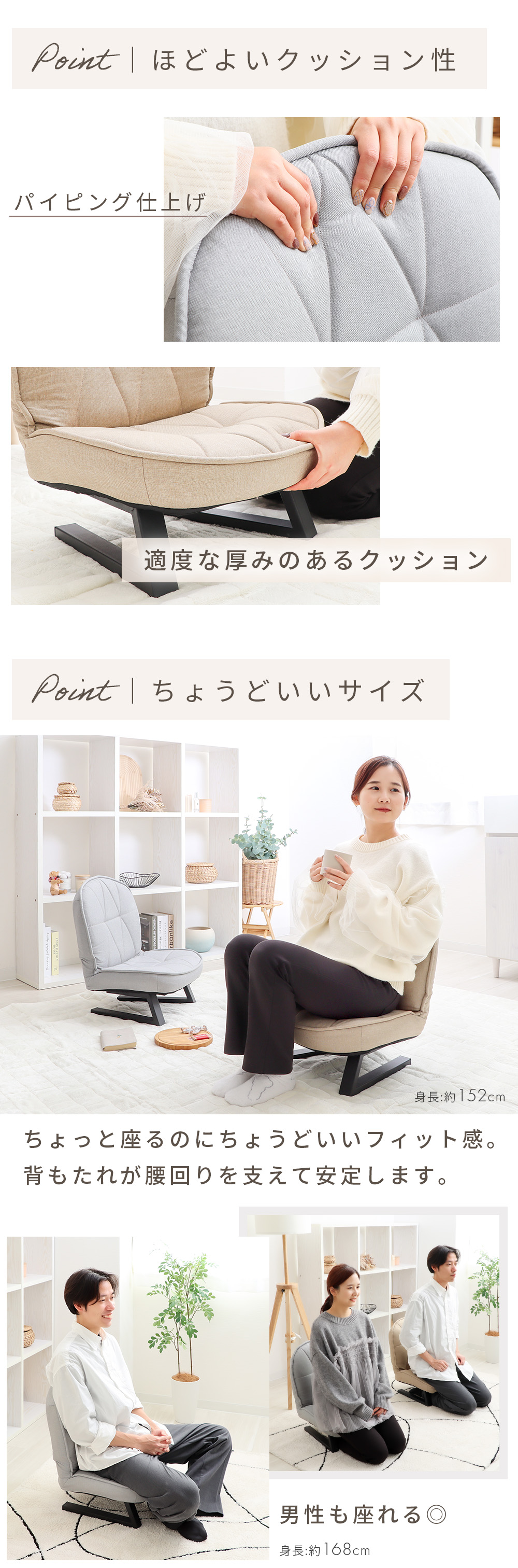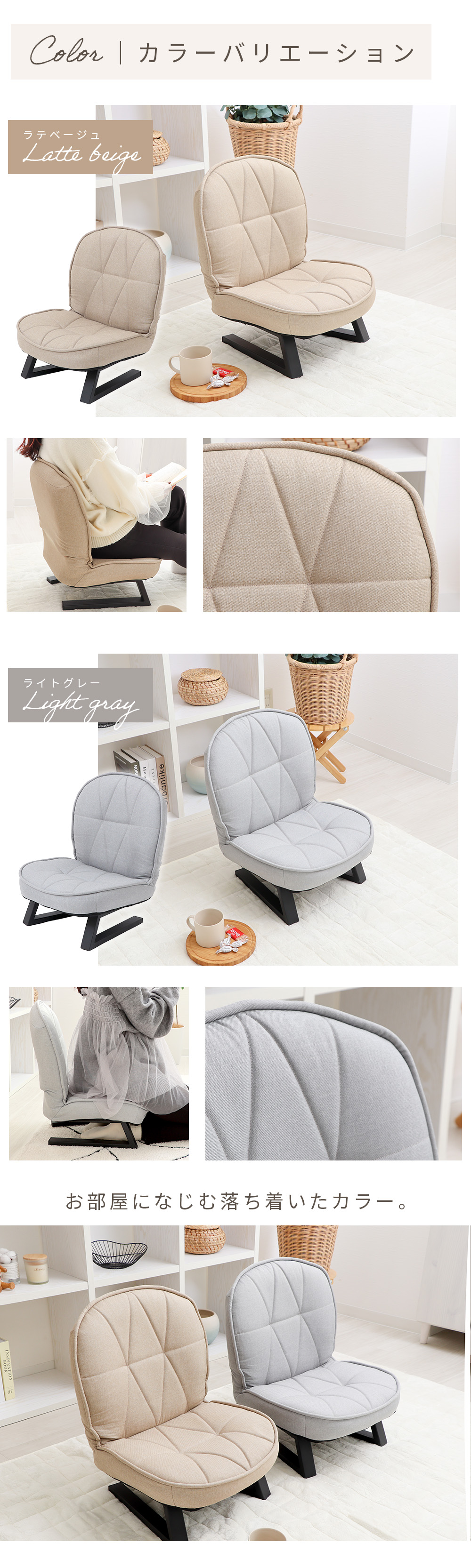 あぐらや正座がしやすい高さとゆとりのあるコンパクト座椅子「Cocona」。