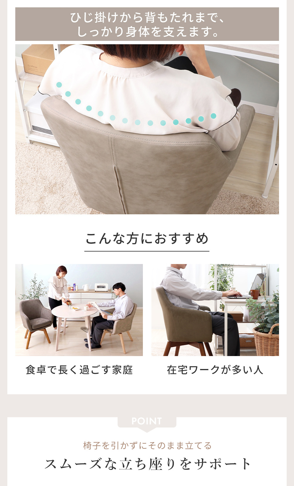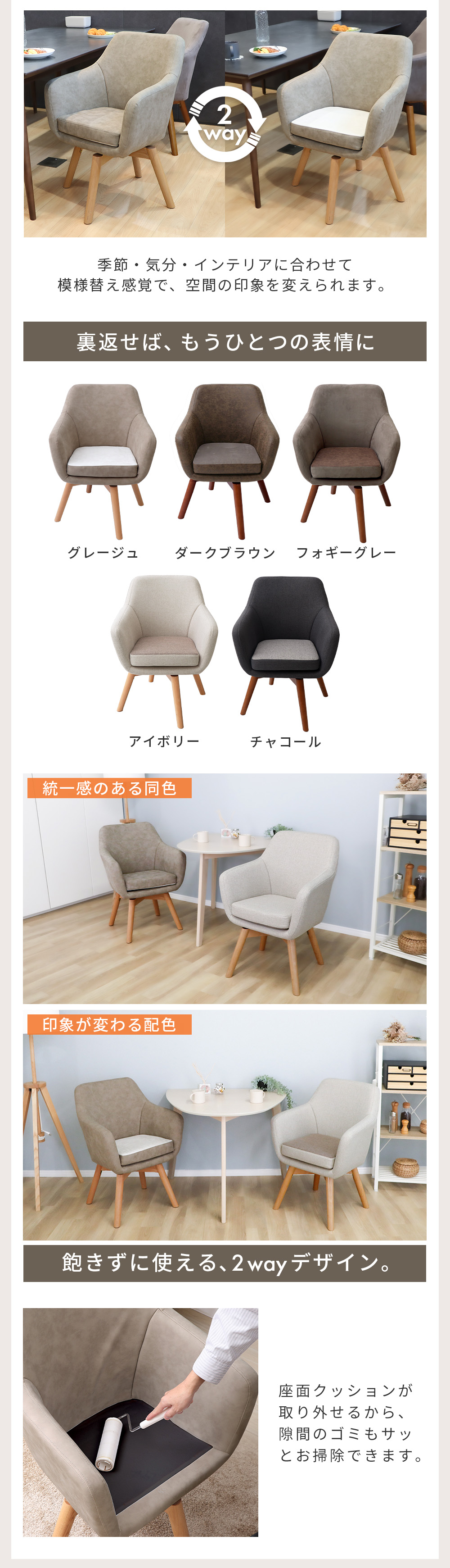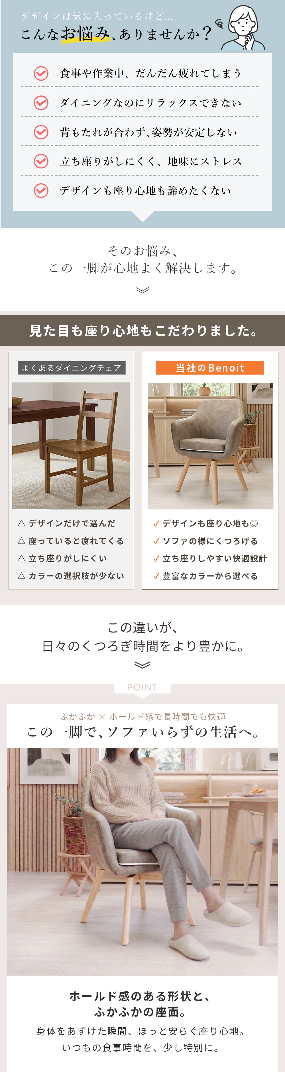 ソファのようにくつろげる座り心地のダイニングチェア【Benoit-ベノワ-】。ふかふかで底付き感のない弾力クッションと、身体を包み込むホールド感のある座面が、長時間でも快適な座り心地を実現します。360度回転式で椅子を引かずに立ち座りでき、日常の動作もスムーズに。アーム付きで立ち上がりも安定し、負担を軽減します。座面クッションはリバーシブル仕様で、気分やインテリアに合わせて簡単に雰囲気チェンジ。天然木ブナ材の脚や撥水加工生地を採用し、デザイン性と実用性を兼ね備えた一脚です。