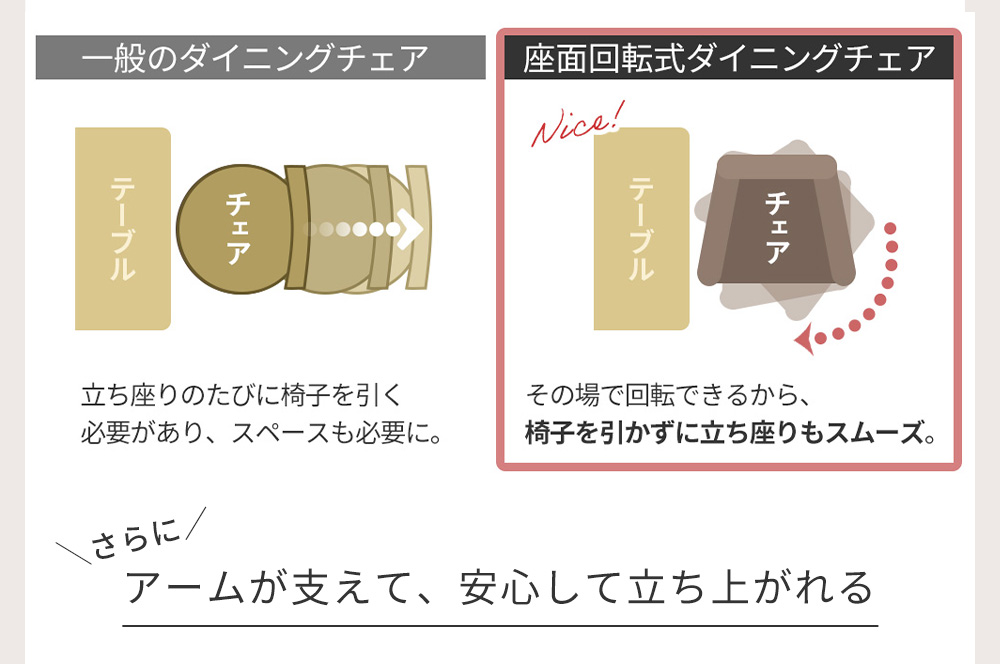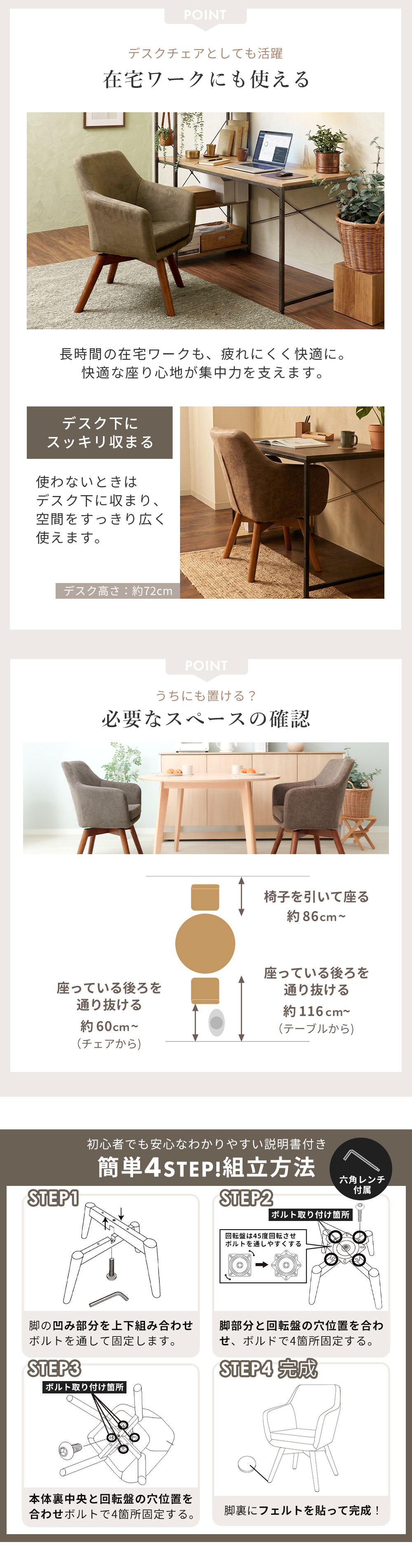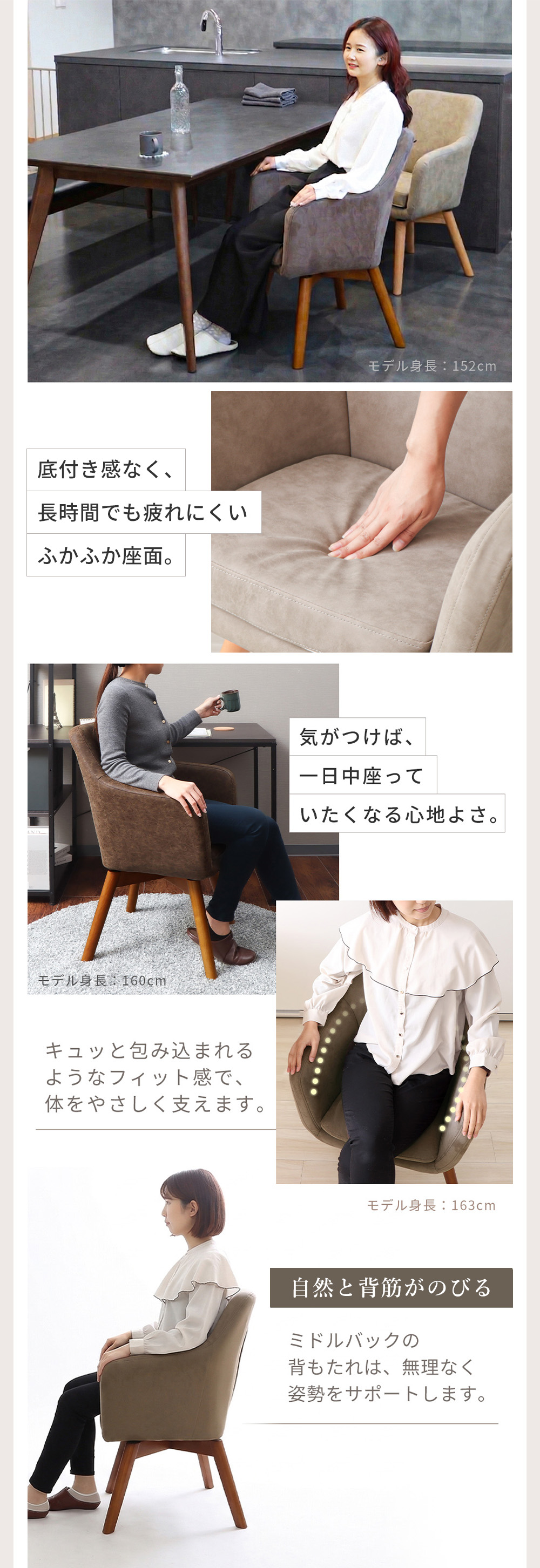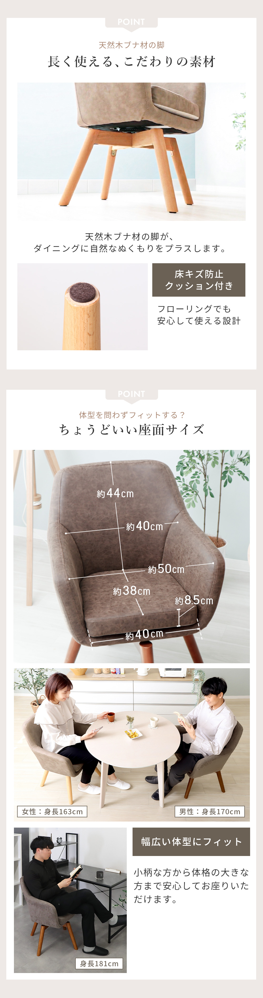 ソファのようにくつろげる座り心地のダイニングチェア【Benoit-ベノワ-】。ふかふかで底付き感のない弾力クッションと、身体を包み込むホールド感のある座面が、長時間でも快適な座り心地を実現します。360度回転式で椅子を引かずに立ち座りでき、日常の動作もスムーズに。アーム付きで立ち上がりも安定し、負担を軽減します。座面クッションはリバーシブル仕様で、気分やインテリアに合わせて簡単に雰囲気チェンジ。天然木ブナ材の脚や撥水加工生地を採用し、デザイン性と実用性を兼ね備えた一脚です。