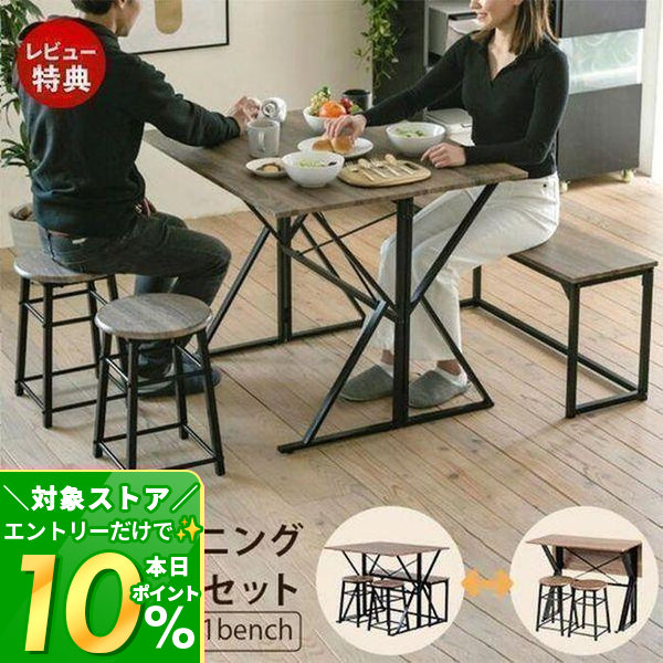 | 商品説明 | シーンに合わせて天板サイズを変えられるダイニングテーブルにイス2脚と2人掛けベンチが付いたダイニング4点セット。デスクとして使っても◎デスクとして使用するときはベンチがラックに、スツールがサイドテーブルに変身! |