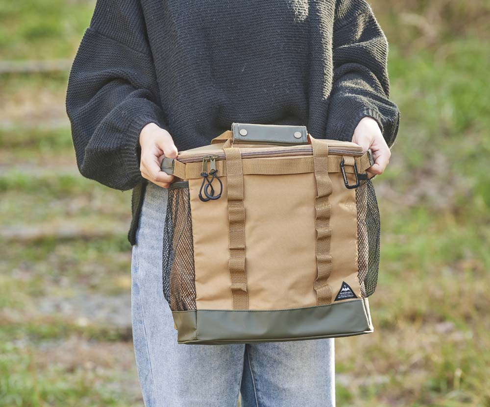 手持ちバッグとして小物収納にも、ショルダーハーネス付きで重たい荷物も運びやすい。