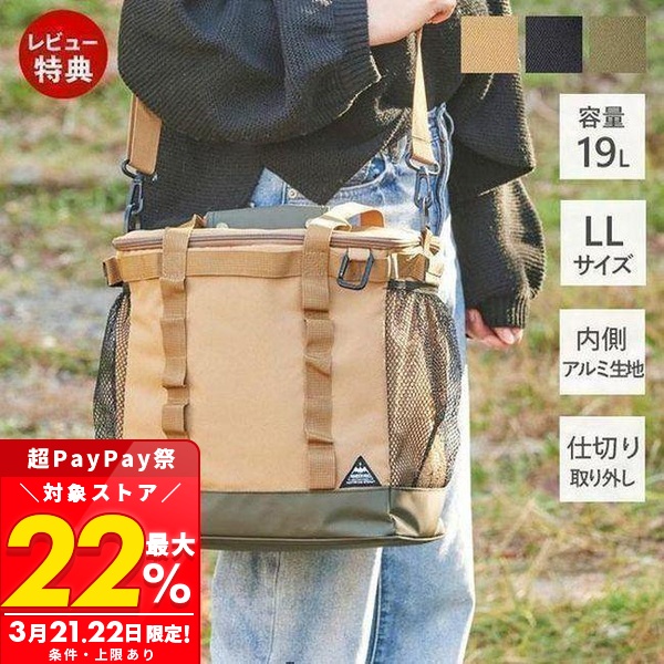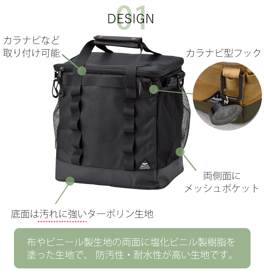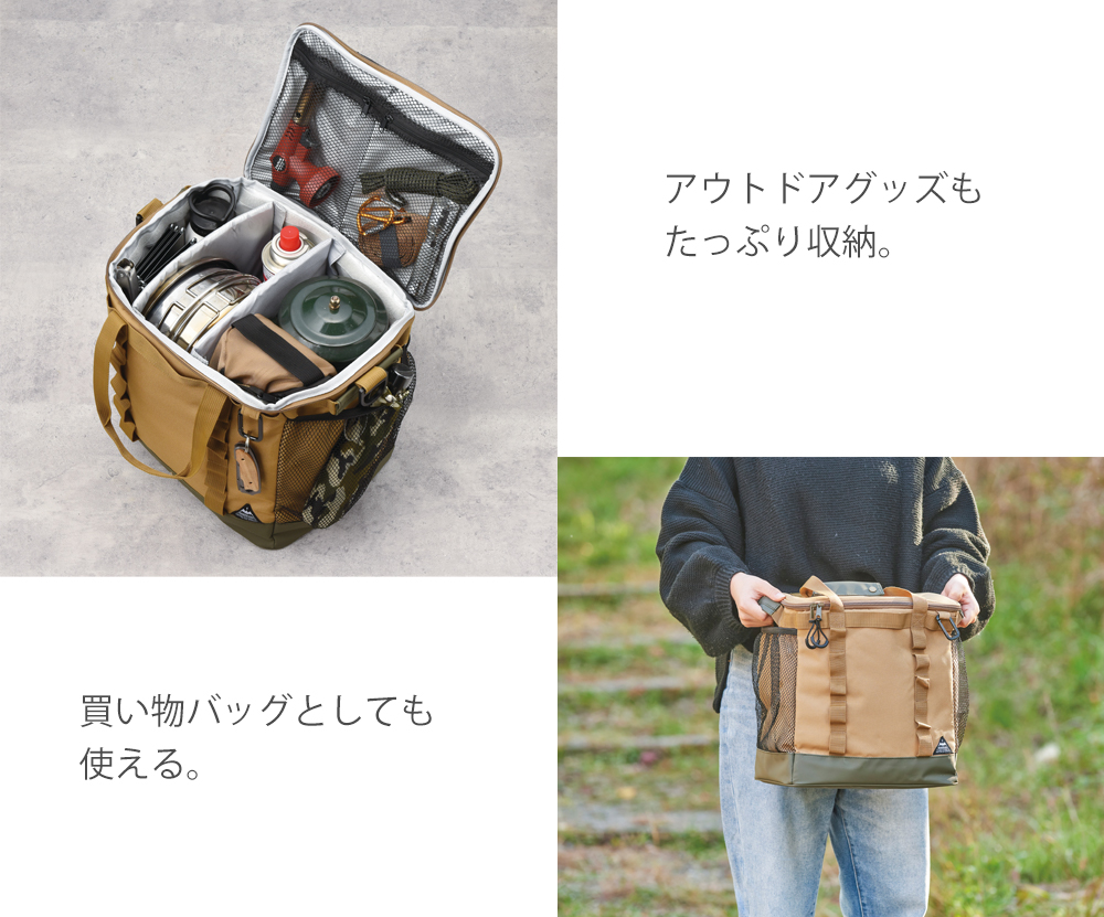 ショルダーベルト付きで重たい荷物も運びやすく、アウトドアでも大活躍。