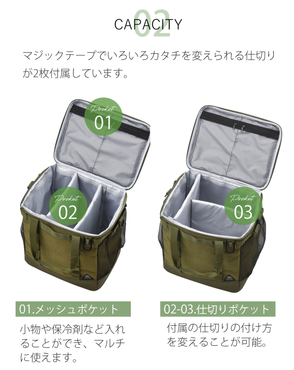仕切りが2枚あり、物に合わせてポケットサイズも変えられます。