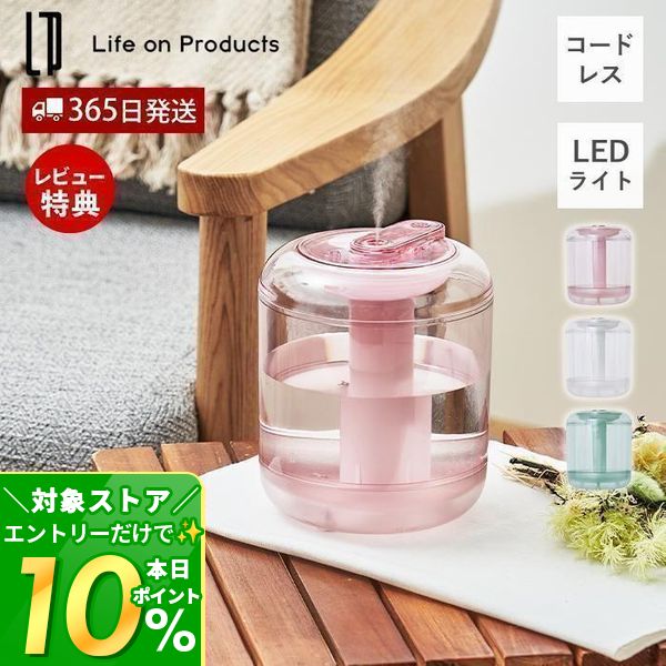 10/10はP+10%還元! 充電式クリア加湿器 LEDライト付 LCAHF005 おしゃれ 超音波式 卓上 コンパクト コードレス オートオフ USB充電 乾燥対策 Life on Products