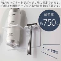 マグネットの耐荷重は約750gと、T字剃刀やシェービングフォームなどの収納には十分な強度があります。マグネットですので、壁面に穴を開けたり両面テープを貼り付ける必要が無く、安心してご利用いただけます。