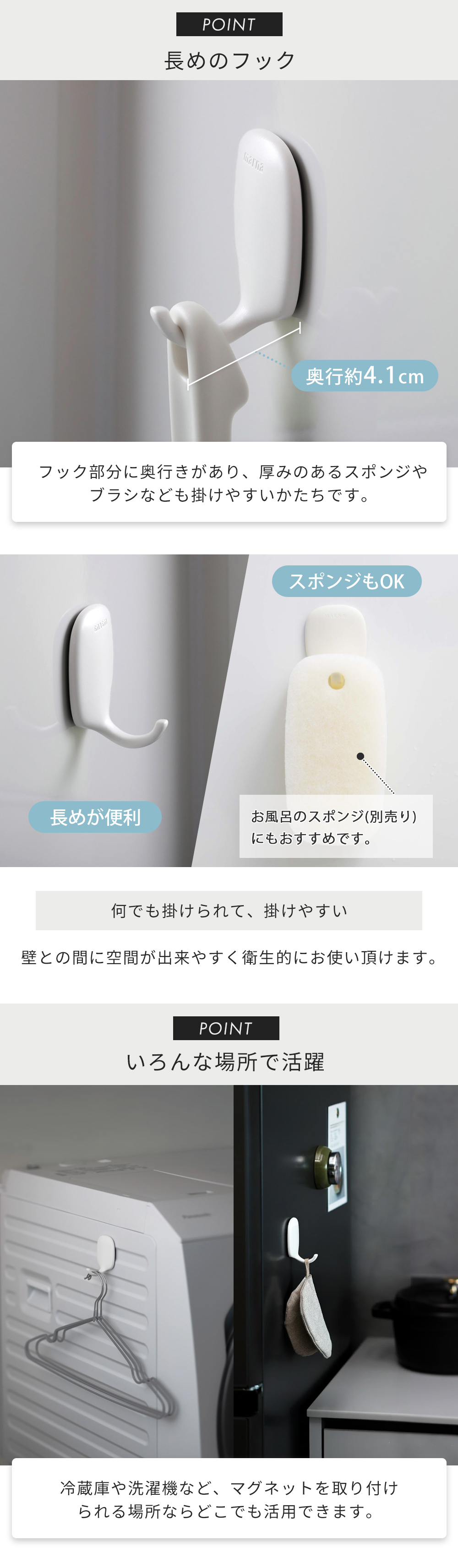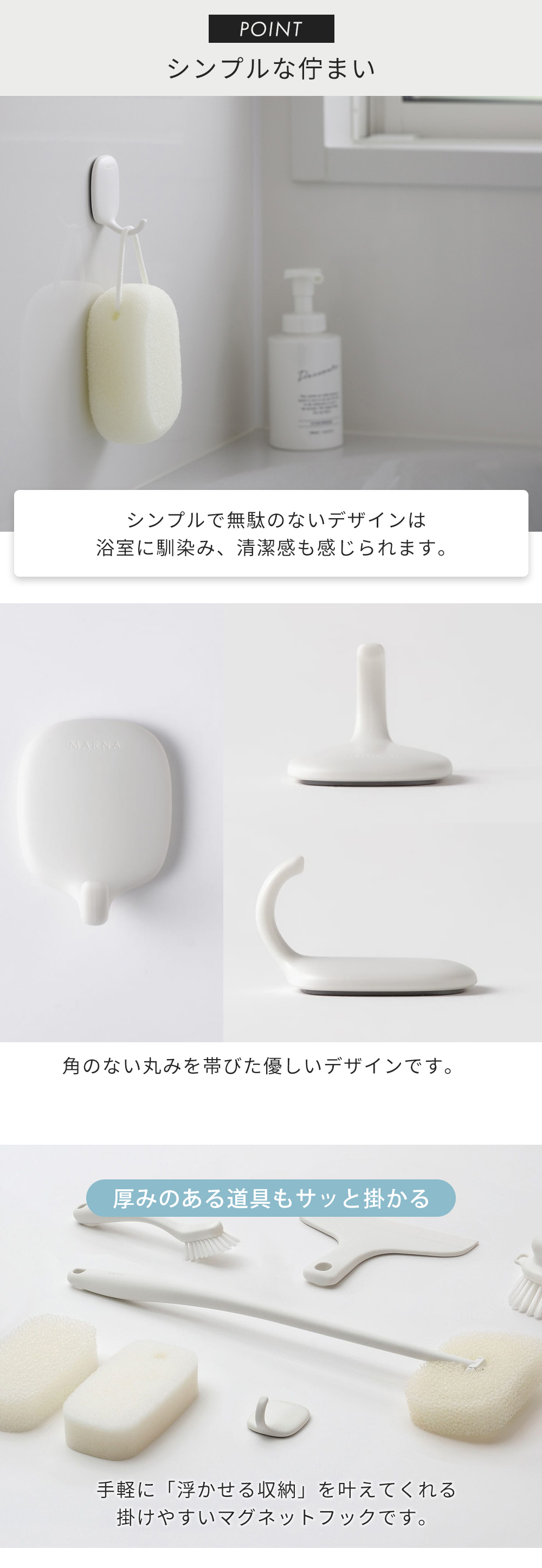 マグネットで浴室の壁面に取り付けられるフックです。フック部分に奥行きがあるので、厚みのあるスポンジやブラシなど、色々なものが掛けられます。サビないラバーマグネットを使用しています。
