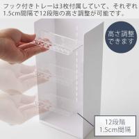 フック付きトレーは3枚付属していて、それぞれ1.5cm間隔で12段階の高さ調整が可能です。保管する物に合わせて、高さをお好みで調整していただけます。