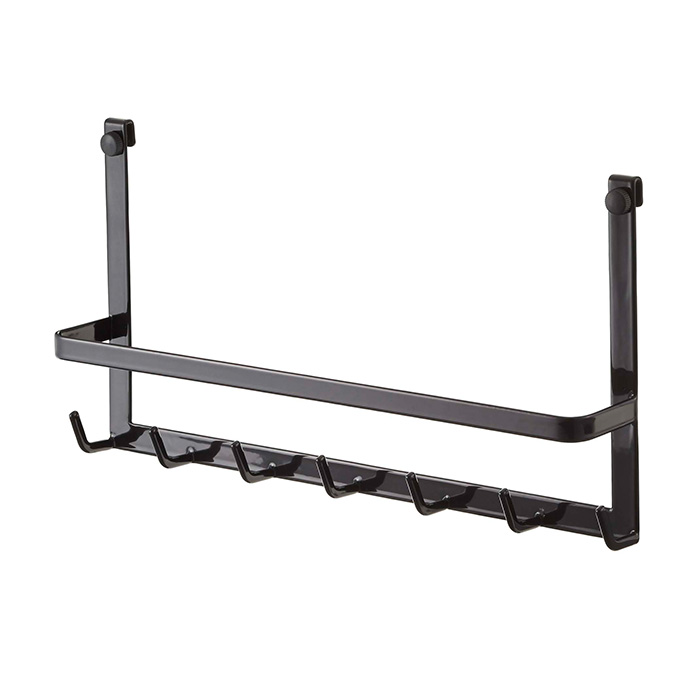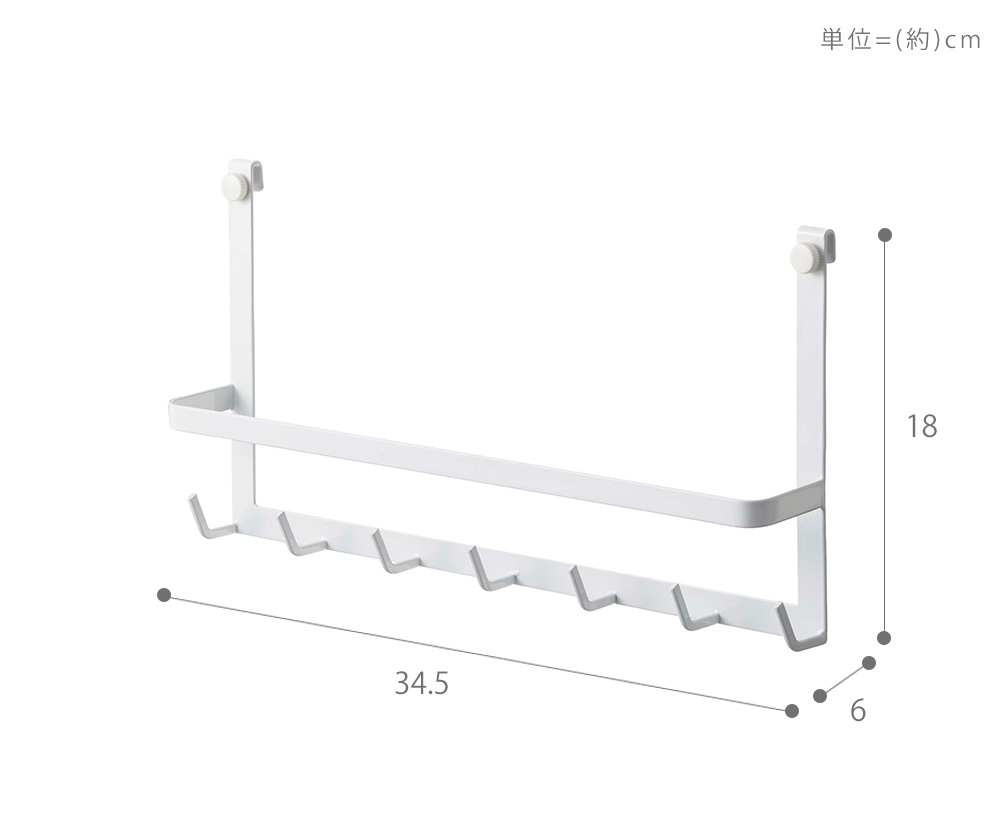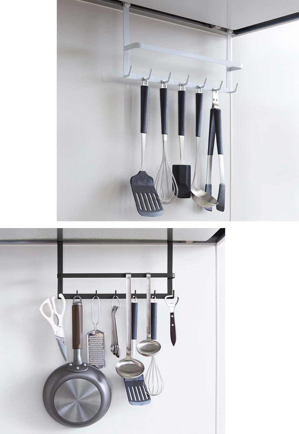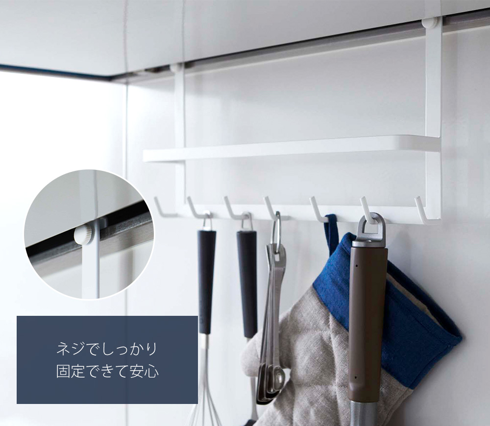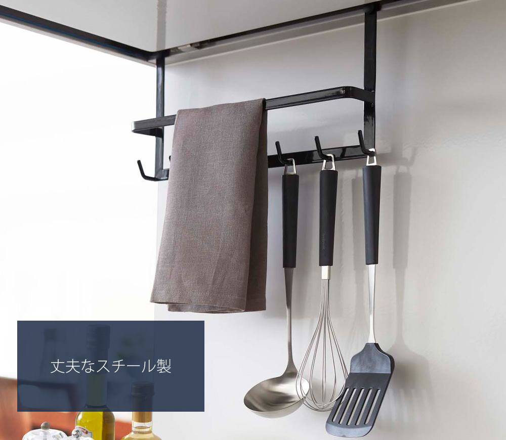 手前のバーはお玉を掛けたり、布巾掛けとしてもご使用いただけます。また、手持ちのフックなどを組み合わせて使用すると、収納の幅がさらに広がります。