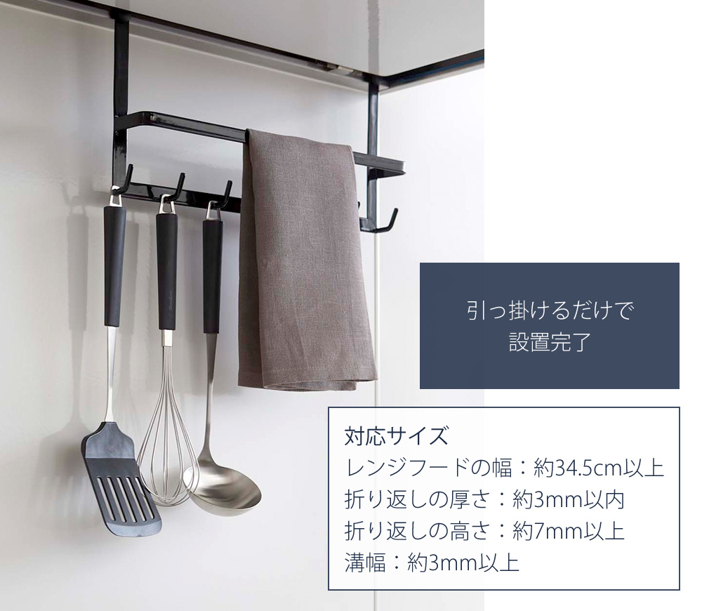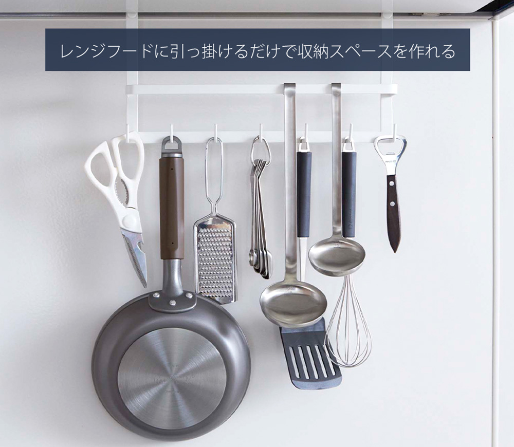 レンジフードに引っ掛けるだけでキッチンツールの収納スペースに