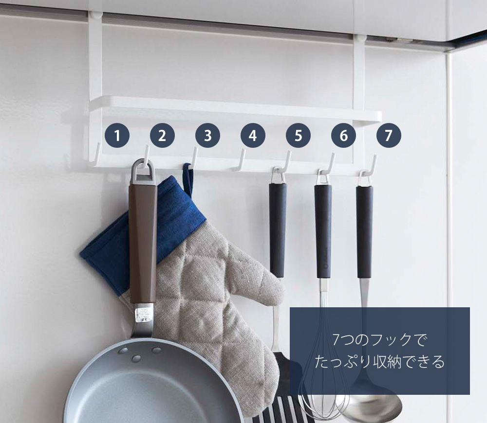 フックは7つあり、お玉やフライ返しや泡だて器、フライパンやミトン、トングなどさまざまなキッチンツールをまとめて収納できます。