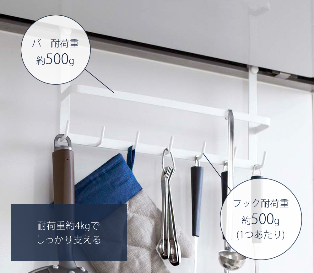 全体の耐荷重は約4kgとフライパンなどもしっかり支えます。バー、フックそれぞれの耐荷重は1つあたり約500gです。