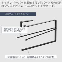 キッチンペーパーを収納する部分は先が広がったV字型のバーで、キッチンペーパーにテンションを掛けて空回りを防ぎます。さらに刃の部分がストッパーの役目もあるシリコン製でキッチンペーパーをきちんと止めてカットしやすくしてくれます。
