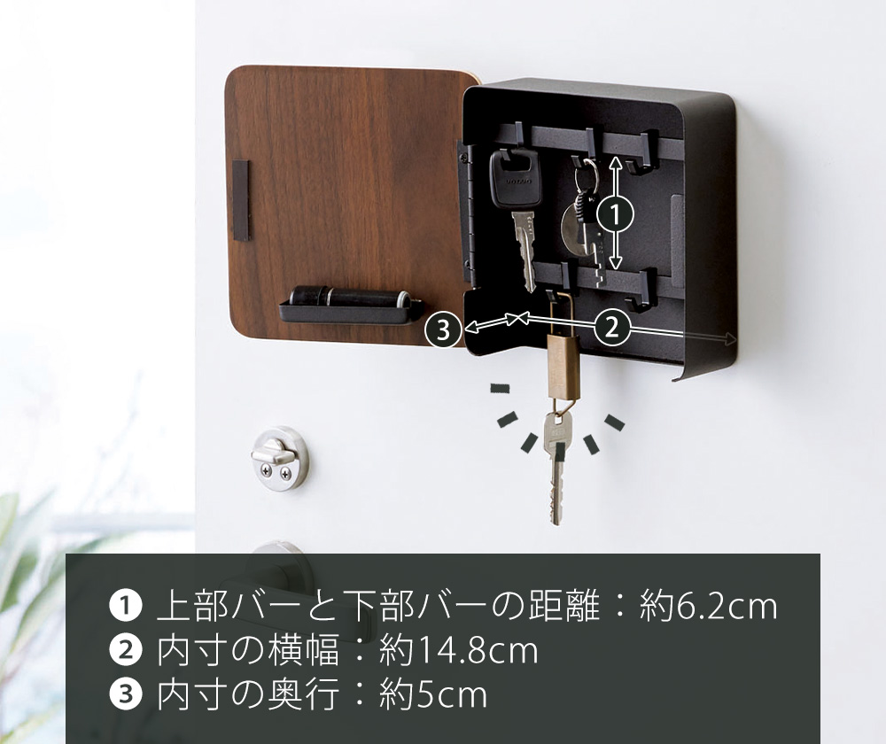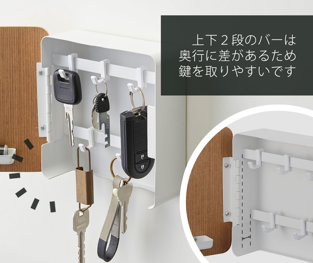 上下2段のバーには奥行きの差があるため、掛けた鍵を取りやすくなります。