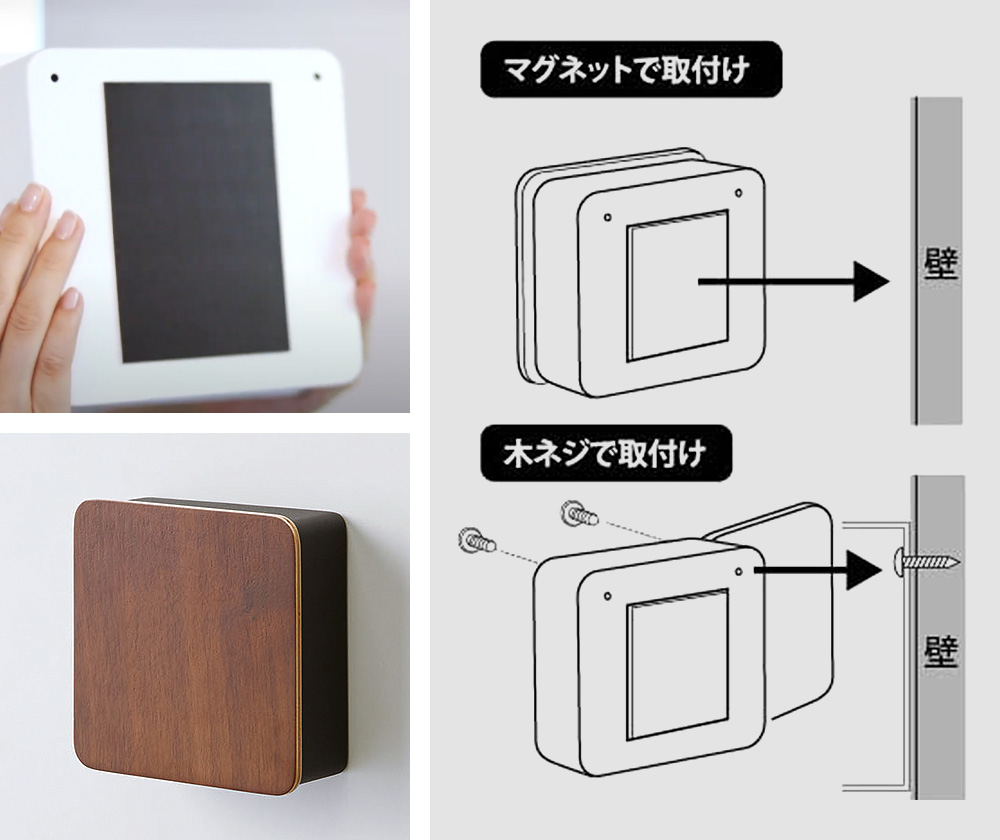 マグネットと付属の木ネジ、2通りの設置方法に対応。設置場所に応じてお使いいただけます。