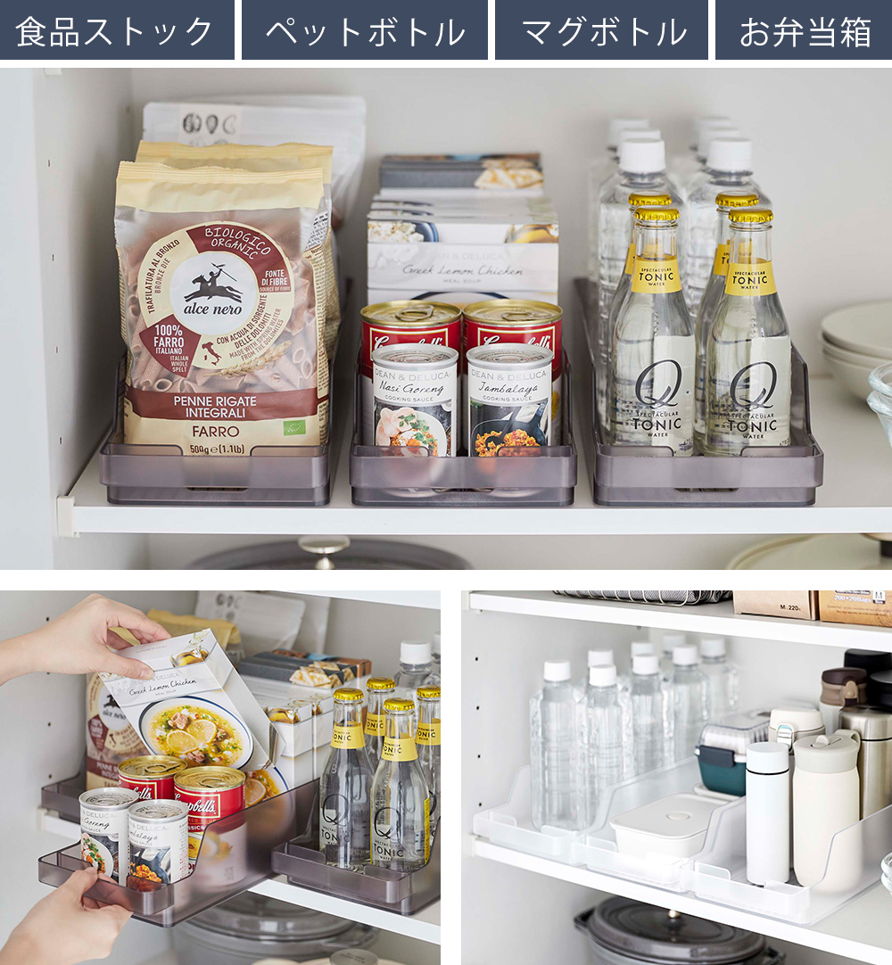 食器棚やストックルームでの整理整頓、マグボトルやお弁当箱の収納にもおすすめです。ハンドル部分にラベリングしても便利です。