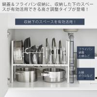 人気の鍋蓋&フライパン収納に、フライパンなどを収納した下のスペースが有効活用できる高さ調整タイプが登場!空いたスペースにお鍋やボウルなどが収納でき、シンク下がすっきりとまとまります。