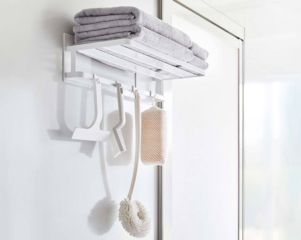 浴室内の壁面にバスタオルやフェイスタオルを収納できる棚を簡単に取り付けることができます。身体を冷やさないように浴室から出る前にしっかり身体を拭くことができます。