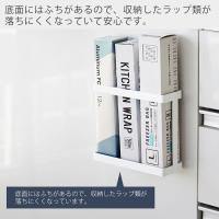 長さのあるラップやアルミホイルを倒さず収納できる仕切り付き。全部で3本収納ができます。仕切りの奥には隙間が設けてあり、約幅17.5cmまでのレシピブックなどを立てて収納も可能です。