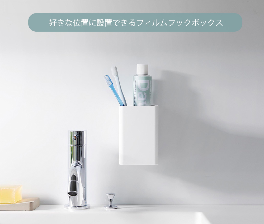洗面台奥の壁やお風呂のタイル壁が収納に早変わり。洗面グッズ・キッチン用品などを使いやすい位置に設置できるフィルムフックのストレージボックスです。