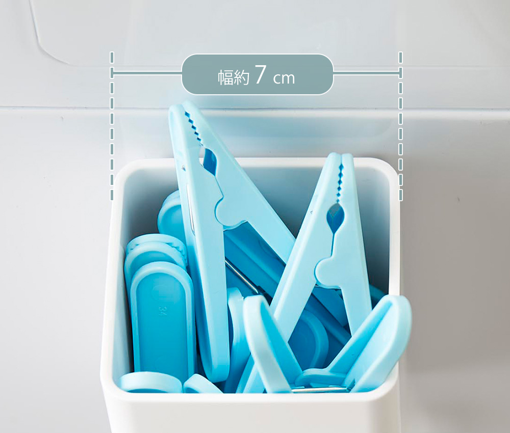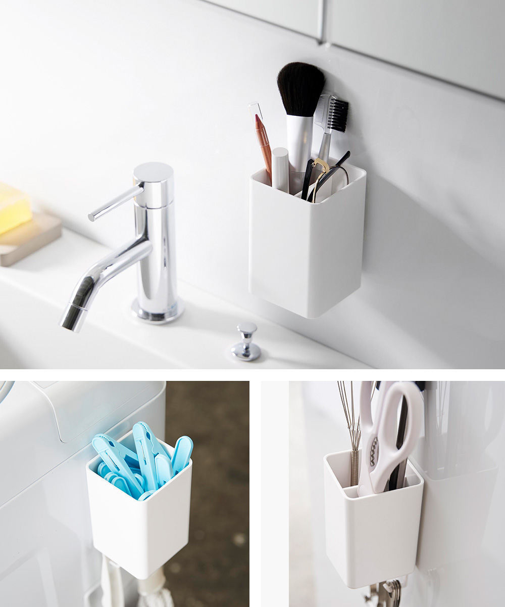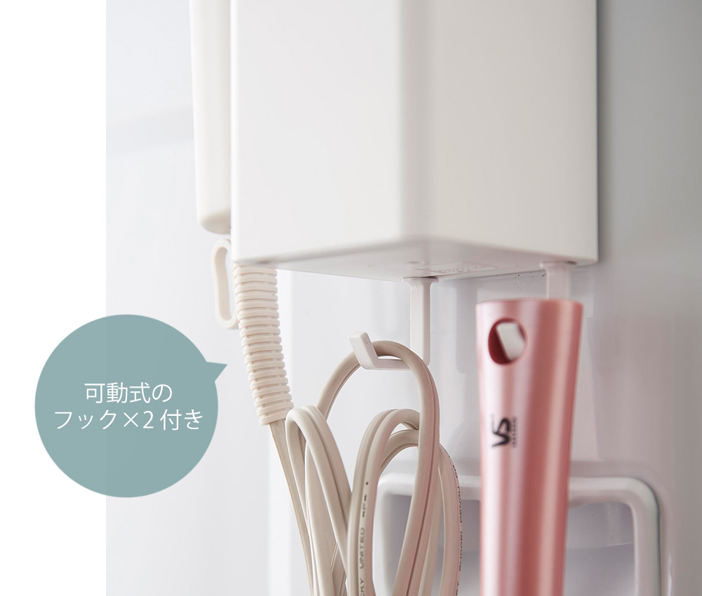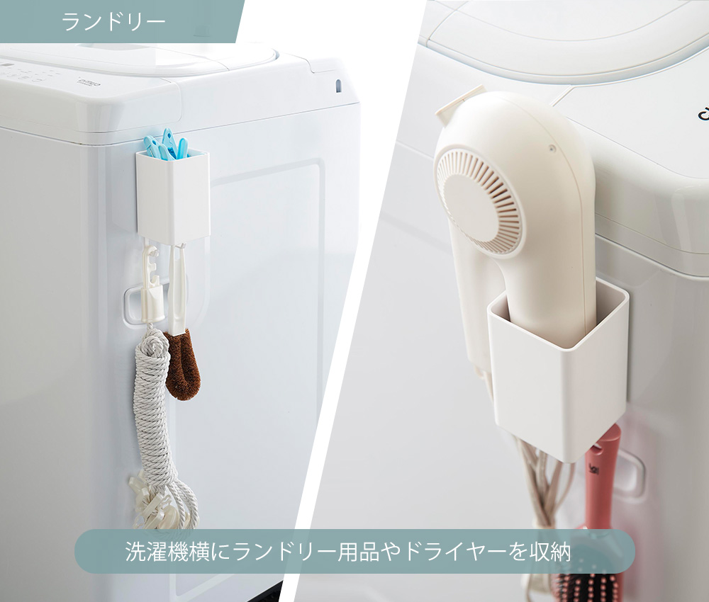 洗濯機横に取り付ければ、洗濯時に使う洗濯ばさみなどの収納ボックスに早変わり。耐荷重が1kgあるので、ドライヤーの収納にも使用できます。