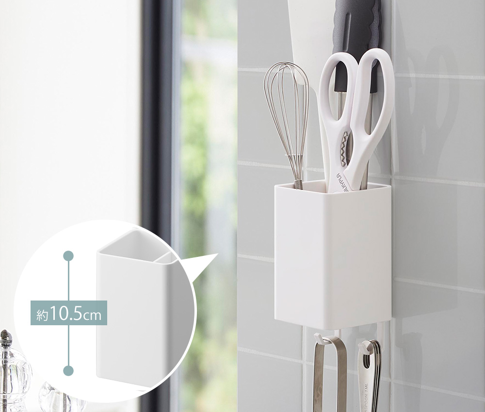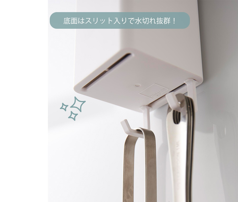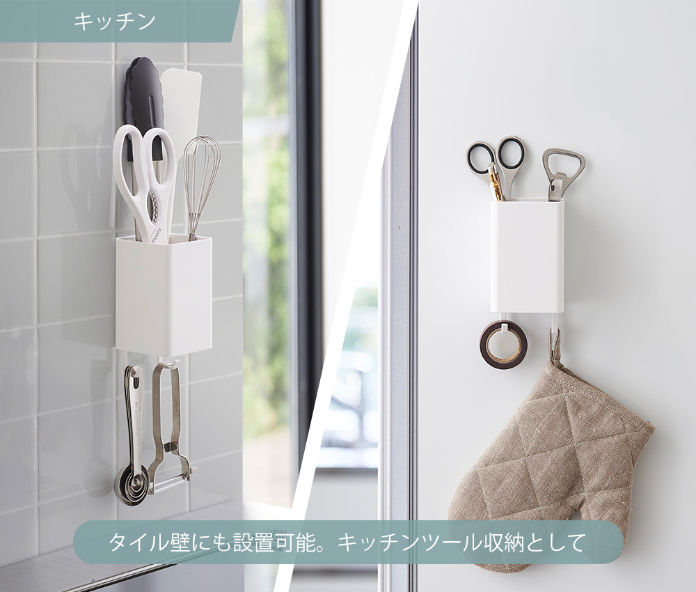 キッチンではキッチンツールラックとしてもご利用いただけます。ボックス下にフックで調理道具を引っ掛けるとさらに便利に。タイル壁にも取り付けできるのでマグネットがつかなくてあきらめていた浮かす収納を実現できます。