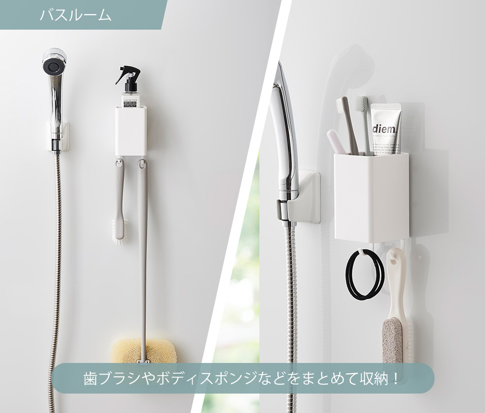 バスルームでは洗面用品とスポンジ・ボディブラシなどを一括収納。お風呂掃除道具入れとしても活躍します。