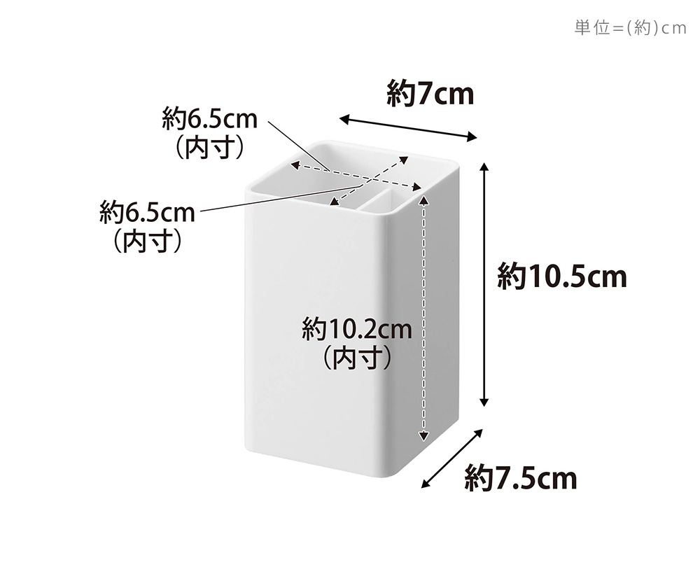 | サイズ | 本体:約幅7×奥行7.5×高さ10.5cm(フィルムフック含まず) フック取り付け時:約高さ13cm フィルムフック接地面:約幅6×高さ6cm(1つあたり) ボックス内寸:約幅6.5×奥行6.5×高さ10.2cm(仕切り板の溝含まず) |
