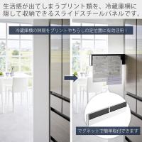 冷蔵庫と壁の隙間がプリントやちらしの定位置に早変わり!生活感が出てしまうプリント類を、冷蔵庫横にペタっと貼って隠して収納できるスライドスチールパネルです。