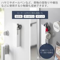 カッター以外にハサミやボールペン・マジックなど、荷物の受け取りや梱包などに使用する小物類を収納できます。フックが1つ付属するので、マスキングテープや鍵などを引っ掛けても便利です。