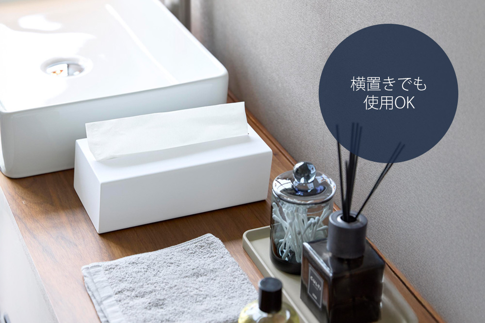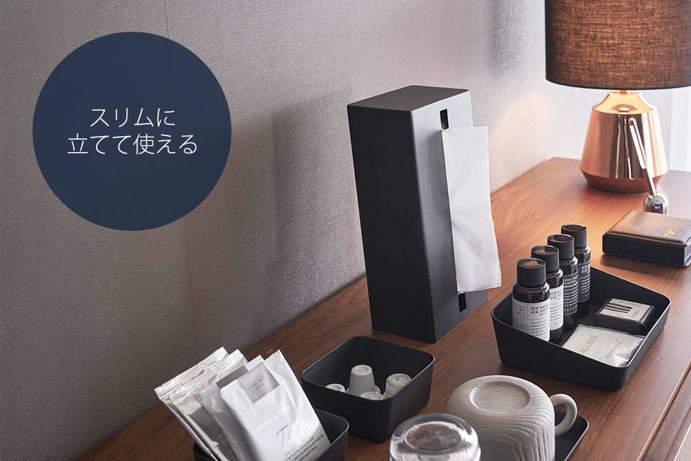 置き場所に困りがちなティッシュケースを、縦置きにすることで場所を取らずスリムに設置できます。