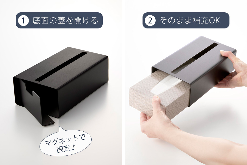 底面の蓋をパカッと開けるだけでティッシュは簡単に補充できます。蓋はマグネットで固定しますのでネジ止めなども不要です。