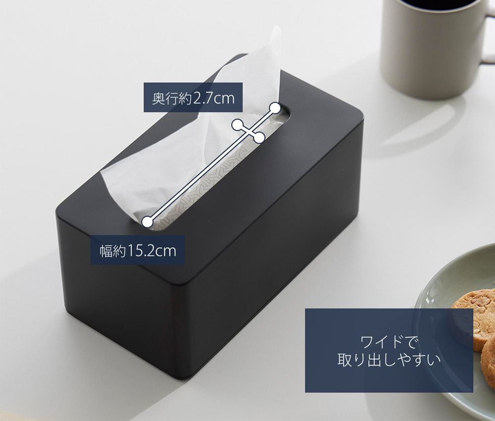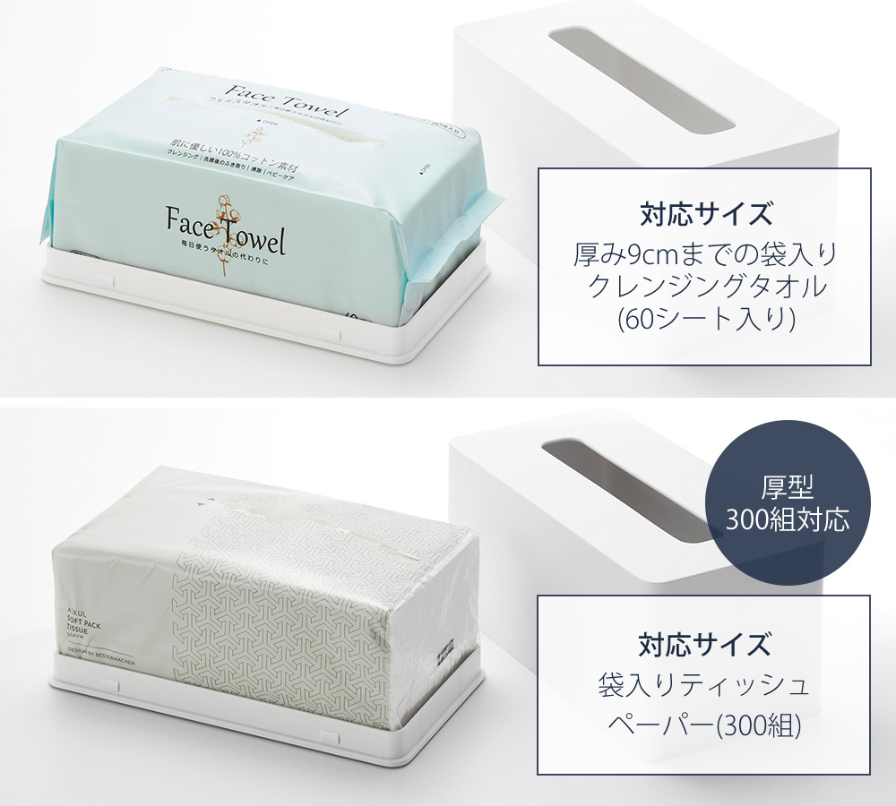 市販の厚み9cmまでの袋入りクレンジングタオル(60シート)を収納することができます。クレンジングタオルだけでなく、袋入りティッシュペーパーにも対応しているので、ダイニングやリビングでも活躍します。