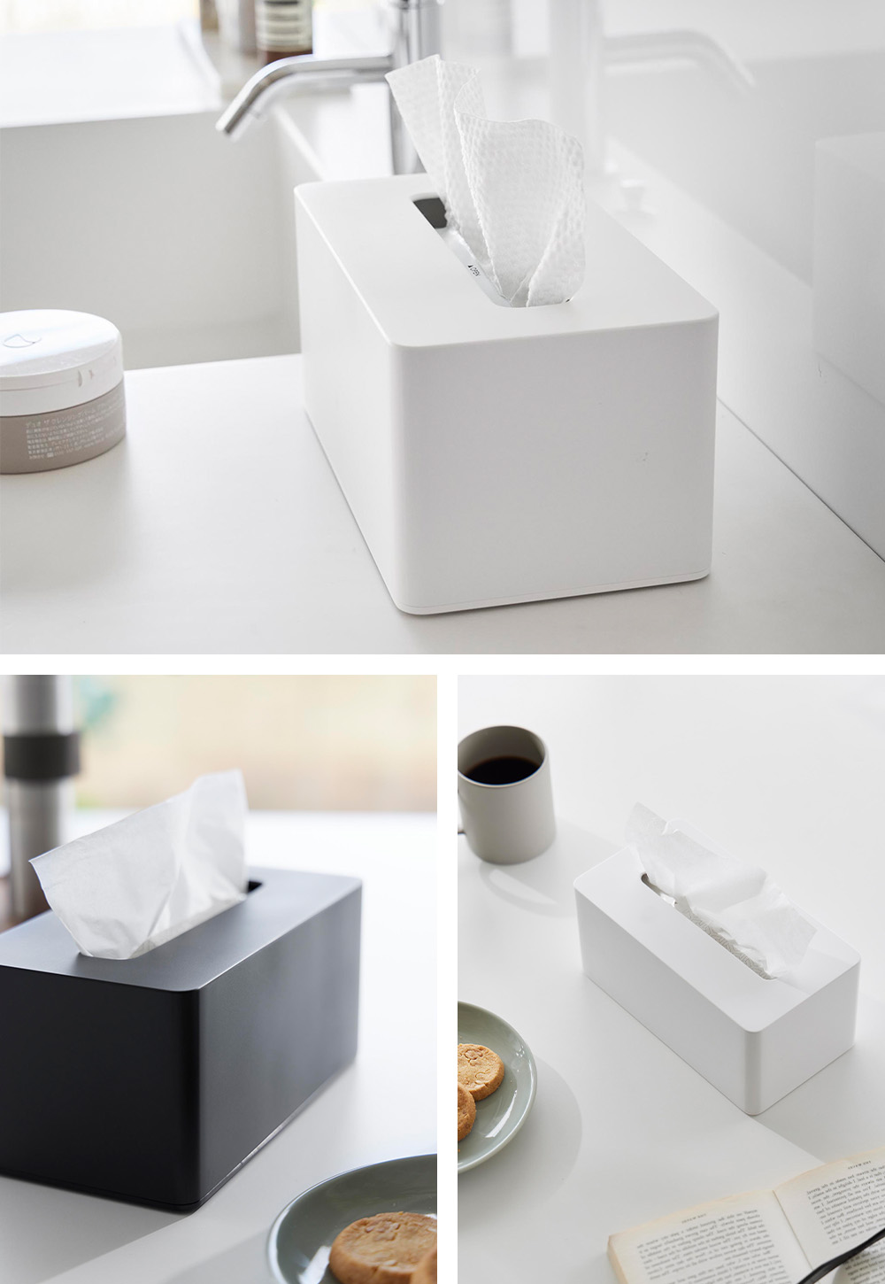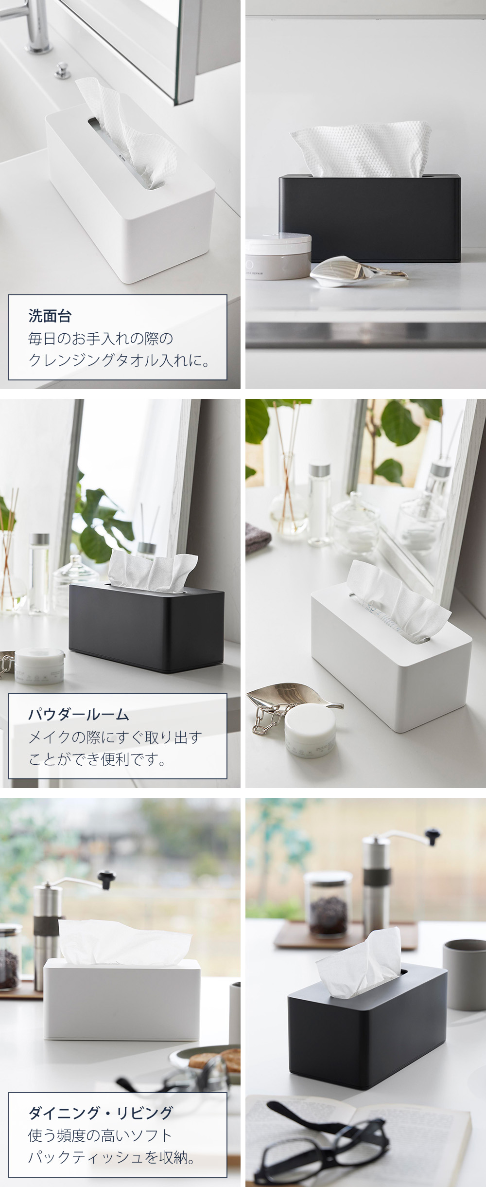 クレンジングタオルやソフトパックティッシュを、ご自宅のあらゆる場所に設置できます。必要な時にすぐに取り出せるので便利です。