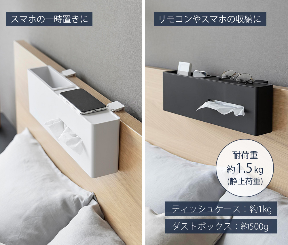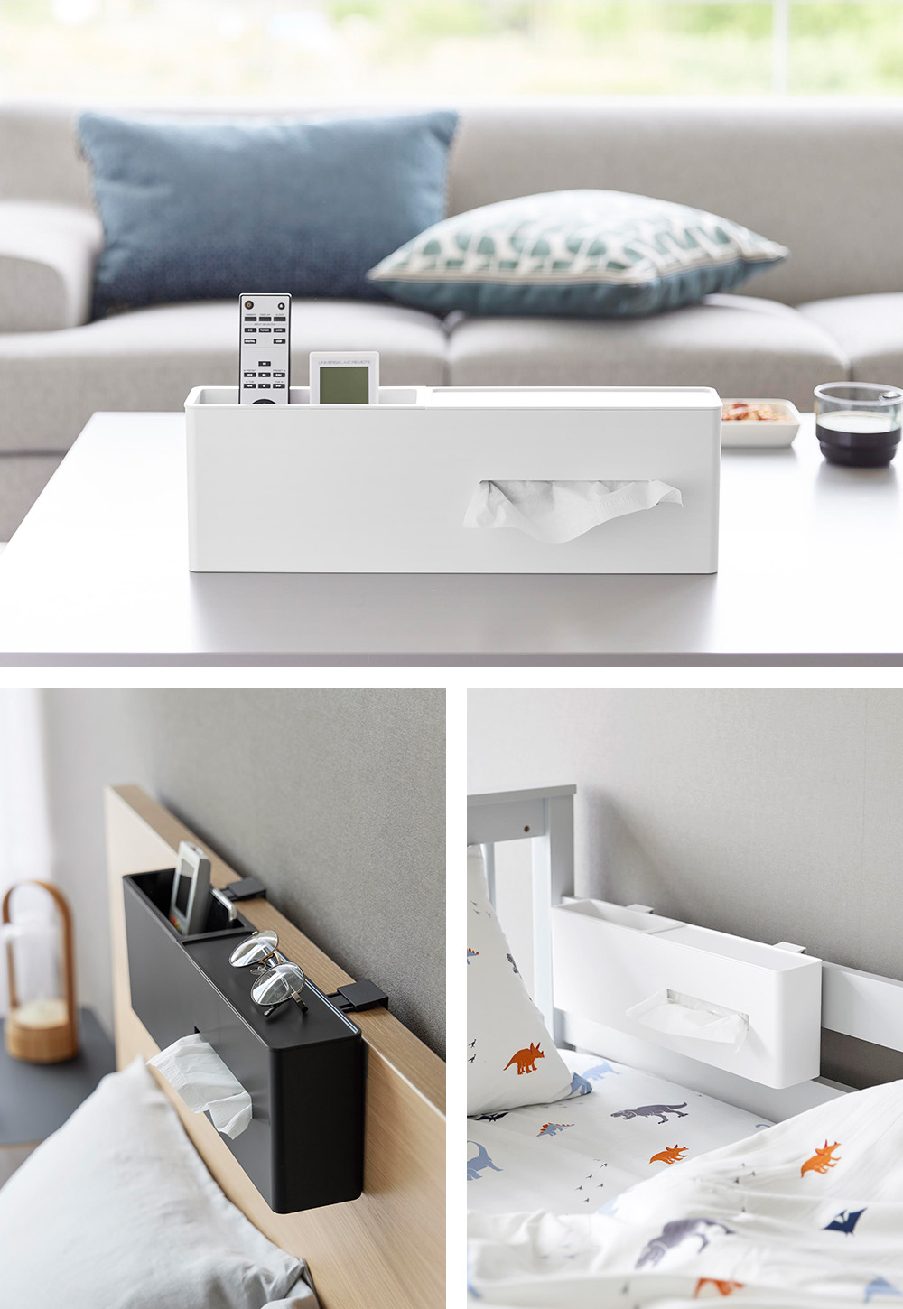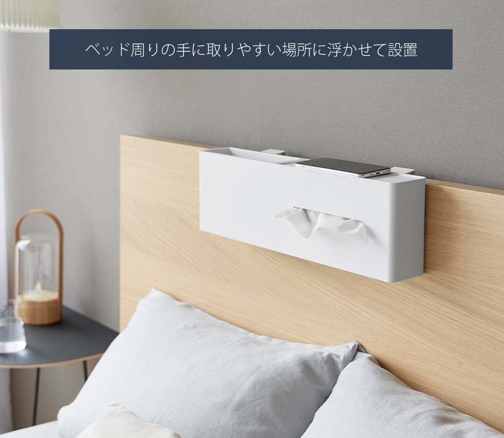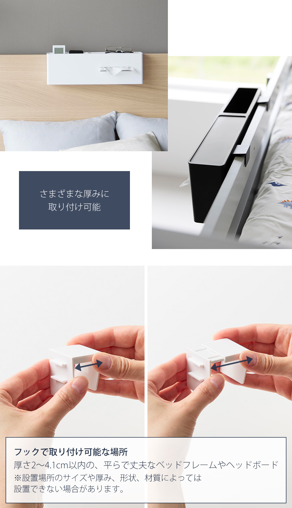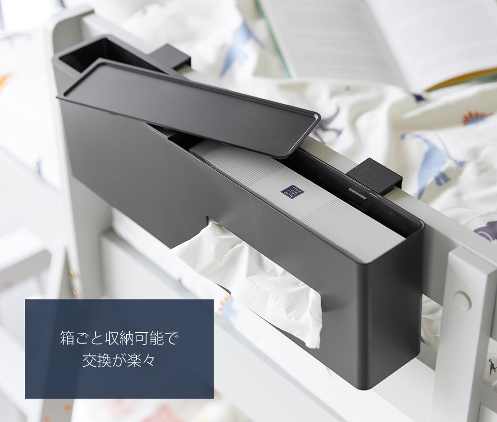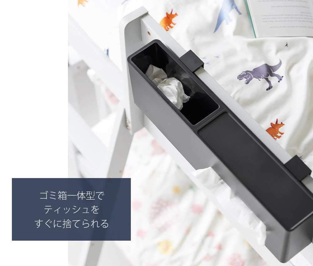 ベッドフレームやベッドのヘッドボードなどに引っ掛けて、ティッシュを必要な時にすぐに取り出すことができるティッシュケースです。