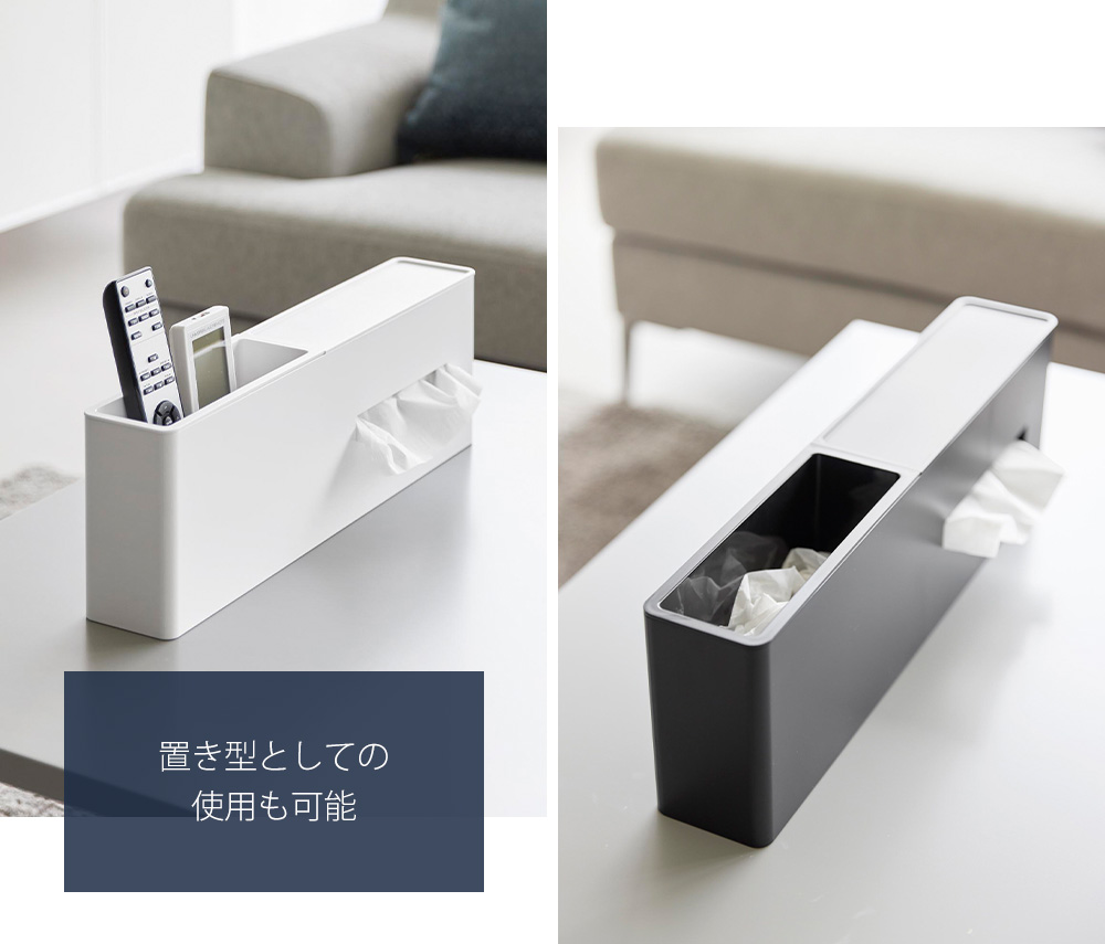 ティッシュケースのフタはトレーにもなり、スマホの一時置きにも便利です。ゴミ箱はリモコンやスマホの収納場所としてもご使用いただけるので、さまざまな用途で活躍します。