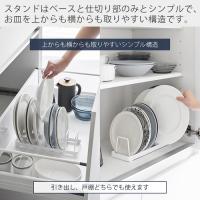 スタンドはベースとお皿を支える仕切り部のみとシンプルで、お皿を上からも横からも取りやすい構造です。縦向き・横向きどちらでも設置でき、引出し・戸棚どちらでもご使用いただけます。