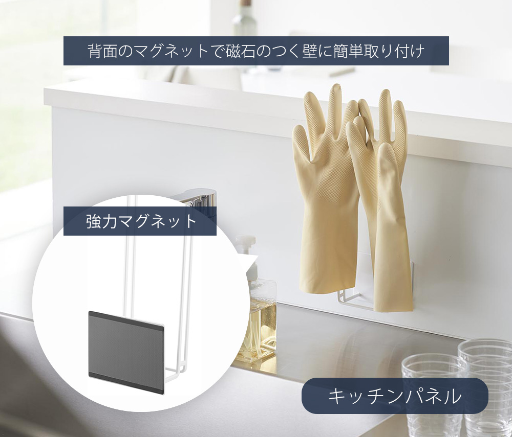 洗い物のたびに使いたいのに、大きいから使った後の置き場所に悩んでしまうゴム手袋の定位置が作れるマグネットホルダーです。